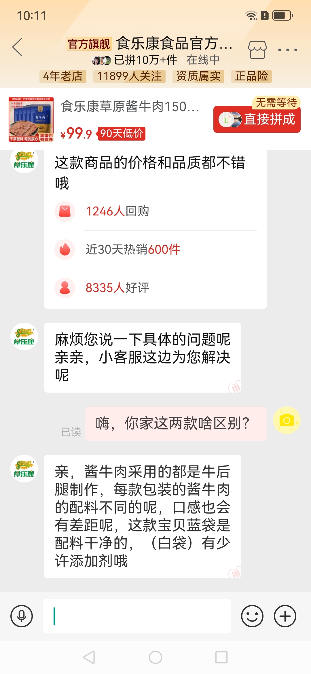 $东方甄选(HK|01797)$ 我帮你们问了一下,看一下,商家卤牛肉合计有两款,一个99.9,一个就是你们抹黑的75,来看官方回复:亲,酱牛肉采用的都是牛后腿制作,每款包装的酱牛肉的配料不同的呢,口感有差距,这款宝贝蓝袋是配料干净的,(白袋)有少许添加剂哦