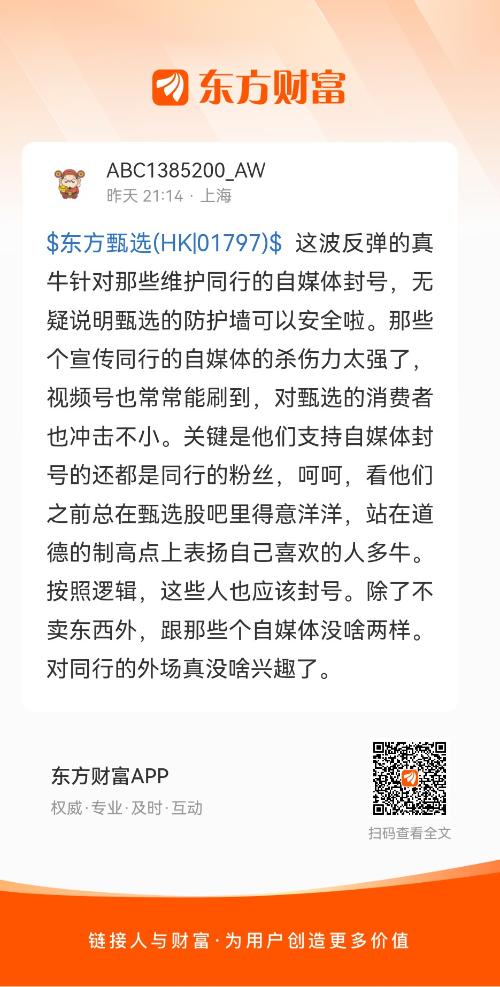 $东方甄选(HK|01797)$ 这波反弹的真牛针对那些维护同行的自媒体封号,无疑说明甄选的防护墙可以安全啦。那些个宣传同行的自媒体的杀伤力太强了,视频号也常常能刷到,对甄选的消费者也冲击不小。关键是他们支持自媒体封号的还都是同行的粉丝,呵呵,看他们之前总在甄选股吧里得意洋洋,站在道德的制高点上表扬自己喜欢的人多牛。按照逻辑,这些人也应该封号。除了不卖东西外,跟那些个自媒体没啥两样。对同行的外场真没啥兴趣了。