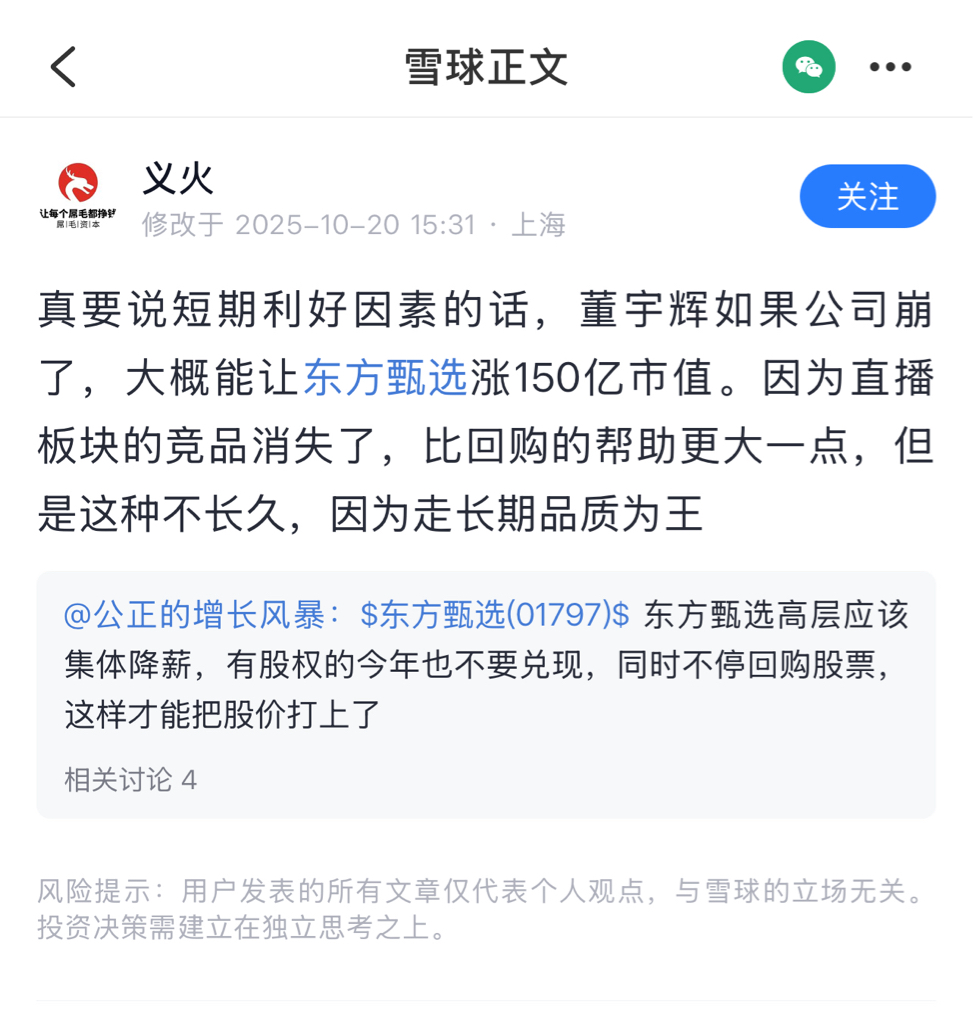 $东方甄选(HK|01797)$ 那群闭眼入不停黑董的原因就是这吧!不好好思考怎么把自己做好,每天就YY别人倒了自己就飞了 还有谁比这个群体更可笑的