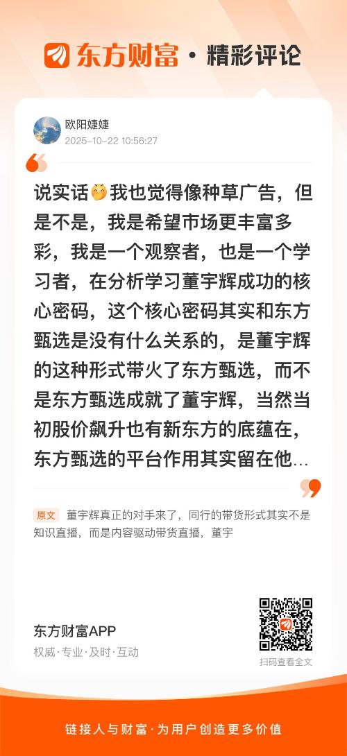 我也觉得像种草广告,但是不是,我是希望市场更丰富多彩,我是一个观察者,也是一个学习者,在分析学习董宇辉成功的核心密码,这个核心密码其实和东方甄选是没有什么关系的,是董宇辉的这种形式带火了东方甄选,而不是东方甄选成就了董宇辉,当然当初股价飙升也有新东方的底蕴在,东方甄选的平台作用其实留在他自己,他自己本身在产业链和品牌经营上做的努力也留在了他们那里,那个就是他们平台的真实实力,事实可见,他们平台的影响力比不上董宇辉的强大影响力,赋予董宇辉影响力的内核不是名人访谈也不是知识赋能,就是兴趣内容是唯一的流量密码,就是董宇辉独特的语言结构营造的氛围感和强烈的情绪同频共振
