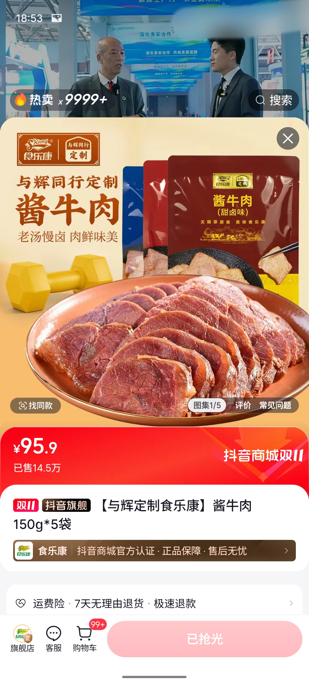 10万单定制酱牛肉三分钟抢完,销售额近千万,我买了2单香辣味,再去买原味就没有了