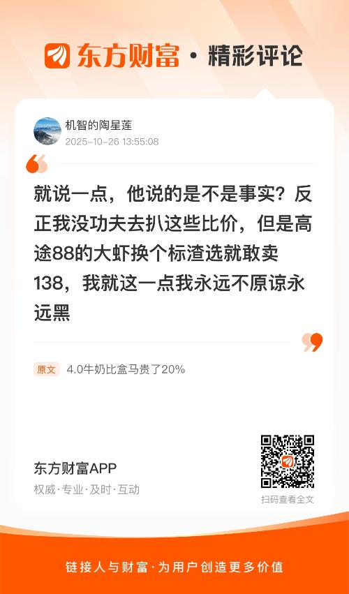 $东方甄选(HK|01797)$ 转雪球:闲来无事,又查了查东方甄选爆款牛奶,乌兰布和4.0G沙漠牛奶,盒马自营居然也有,产地都是陕西渭南市,代工都是中垦华山牧乳业,同一个代工商,同一块乳源地!那价格呢?一个200ml30盒会员价77.39元,单盒2.579元,一个200ml24盒会员价50.9元,单盒2.12元!东方甄选比盒马贵了20%,这是为什么呢?