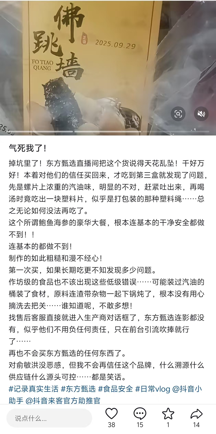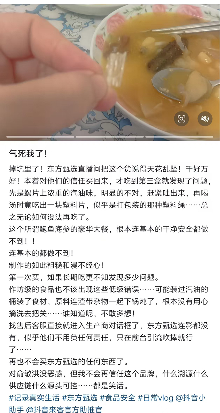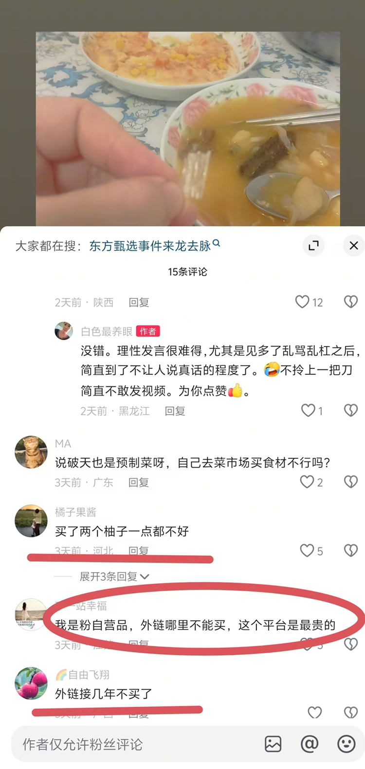 $东方甄选(HK|01797)$ 外链产品动不动就出品质问题不可控。自家的自营品才是抖音最健康的食物。从各个评论区看出大家也是只认可自营品不是吗?那么为什么还要卖外链产品给别人打广告呢?我们已经接近800到1000个sku产品小黄车都装不下了不是吗?