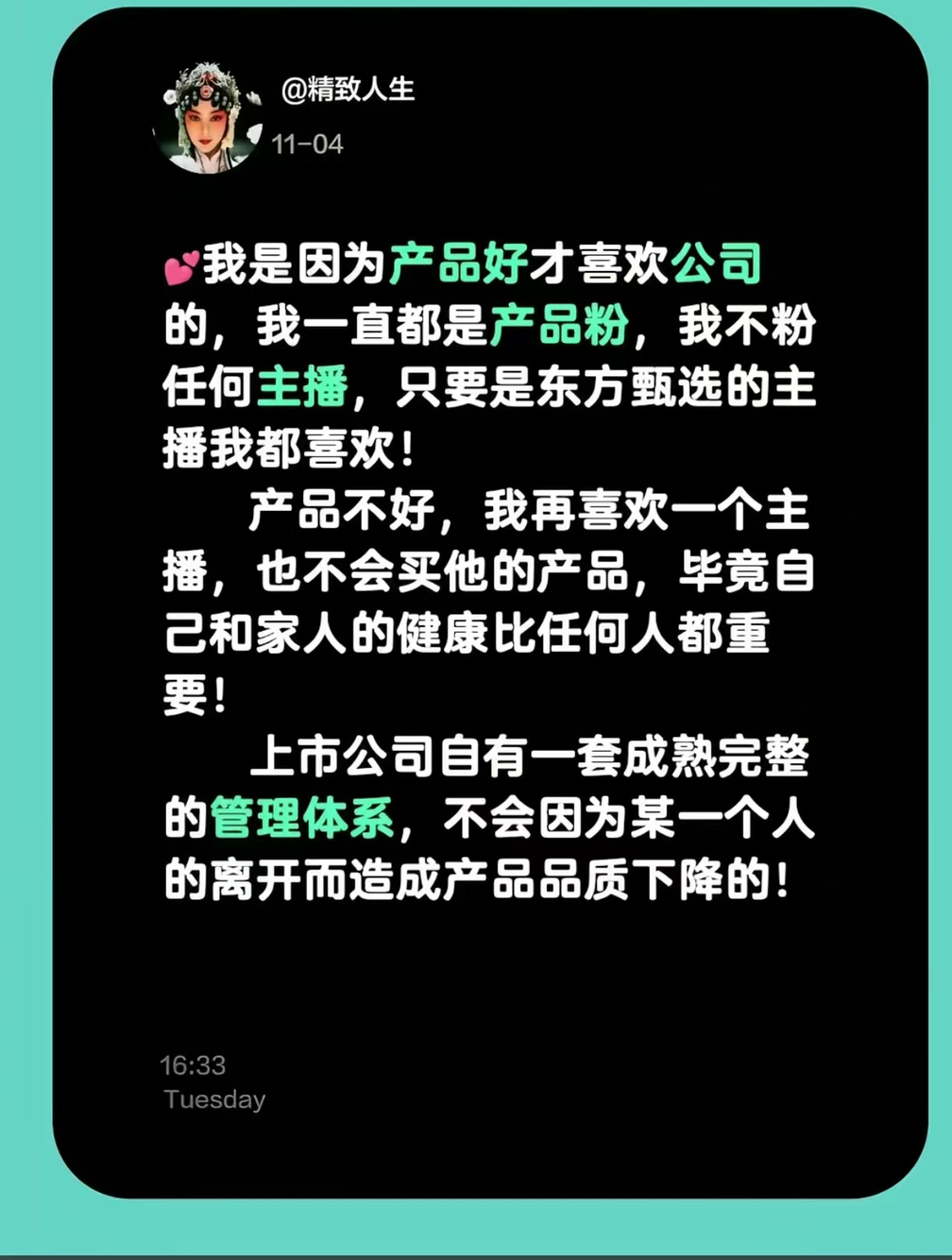 $东方甄选(HK|01797)$ 其实大家都知道我们自营品并不便宜,可为什么愿意买呢?这完全来源于对叔的信任。现在一些人粉丝开始把叔功劳抹掉真应了那句话,当你落魄时才发现身边人到底谁是人是鬼……