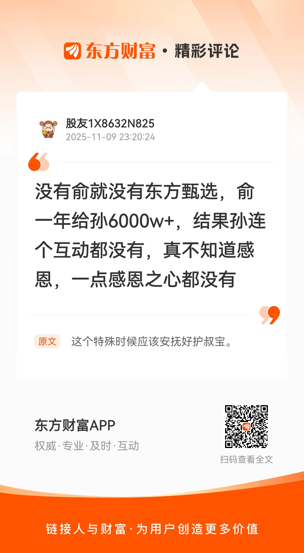 $东方甄选(HK|01797)$ 叔的离开真的让太多宝宝备受打击,这个时候不应该指责而是安抚好把他们都留住。现在这个局面只会让外人看笑话,更可能把他们推向别人直播间!