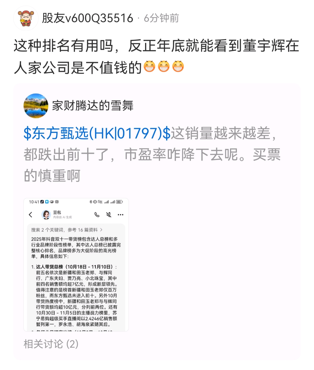 $东方甄选(HK|01797)$ 这脑回路也是清奇,董宇辉还需要“东方甄选”来证明自己吗?东方甄选倒是应该到处证明自己值不值钱,哈哈哈哈哈