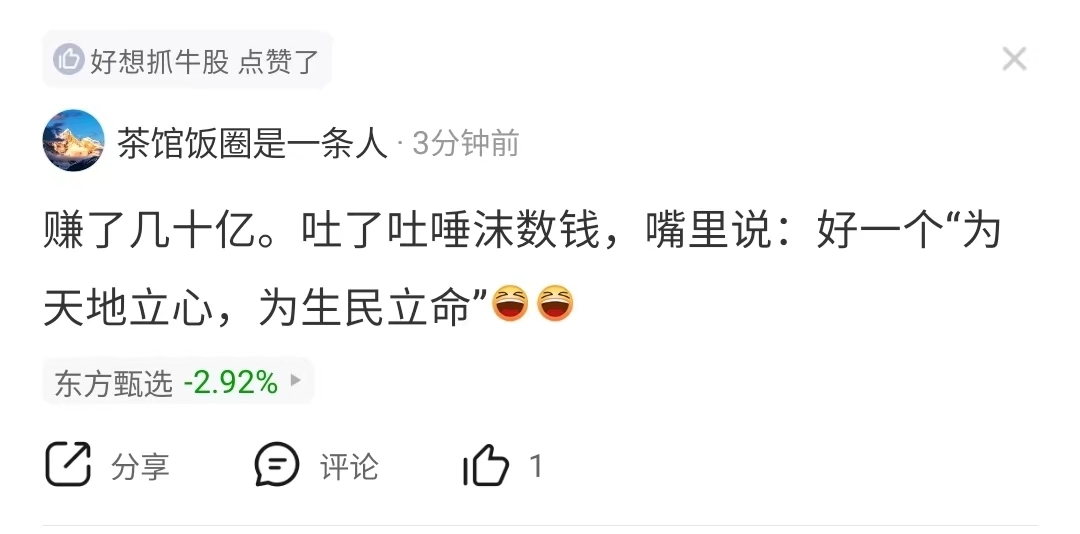 $东方甄选(HK|01797)$ @茶馆饭圈是一条人 @好想抓牛股 牛哥,一个人扮演两号不累吗,左右互搏