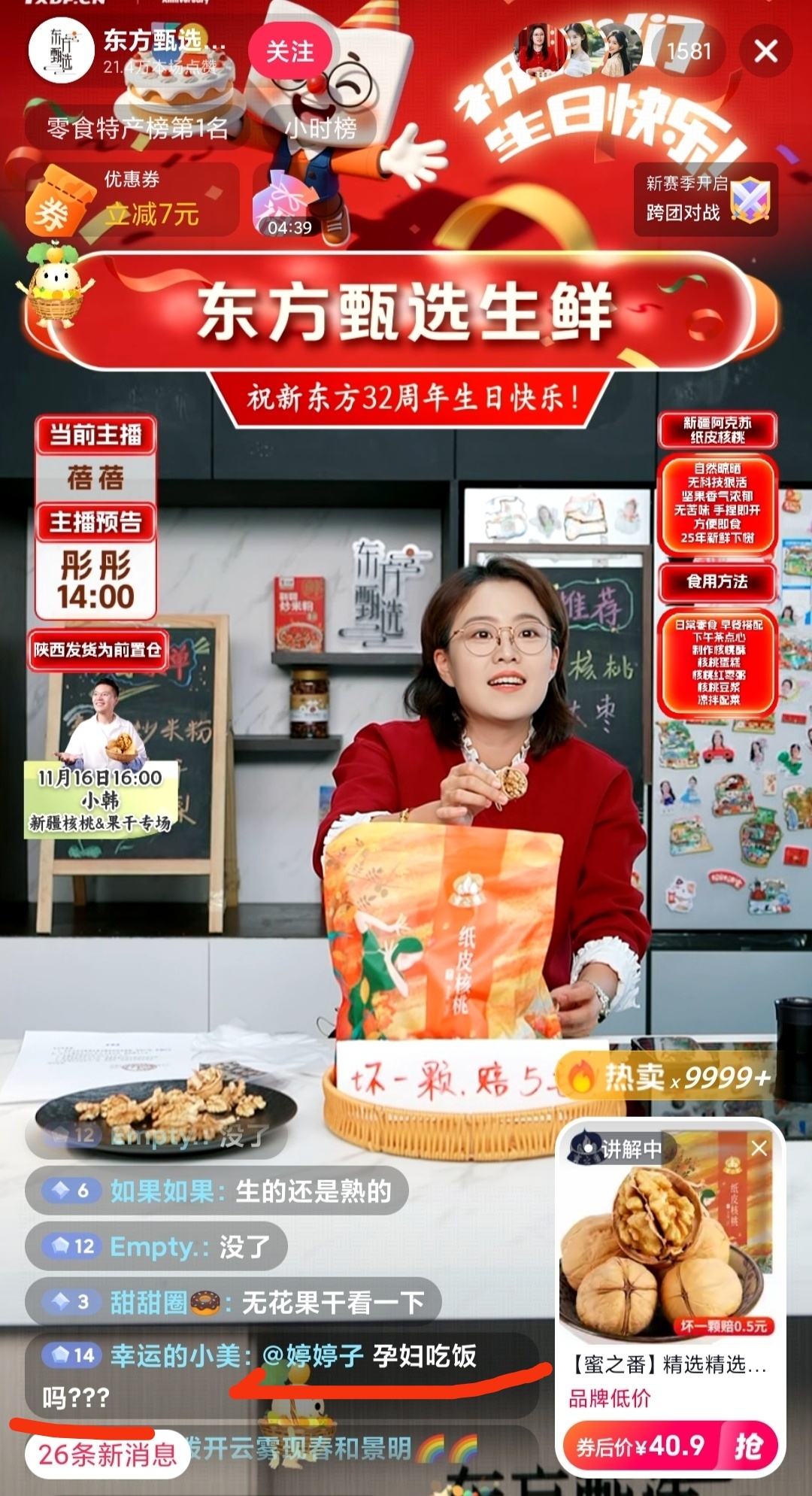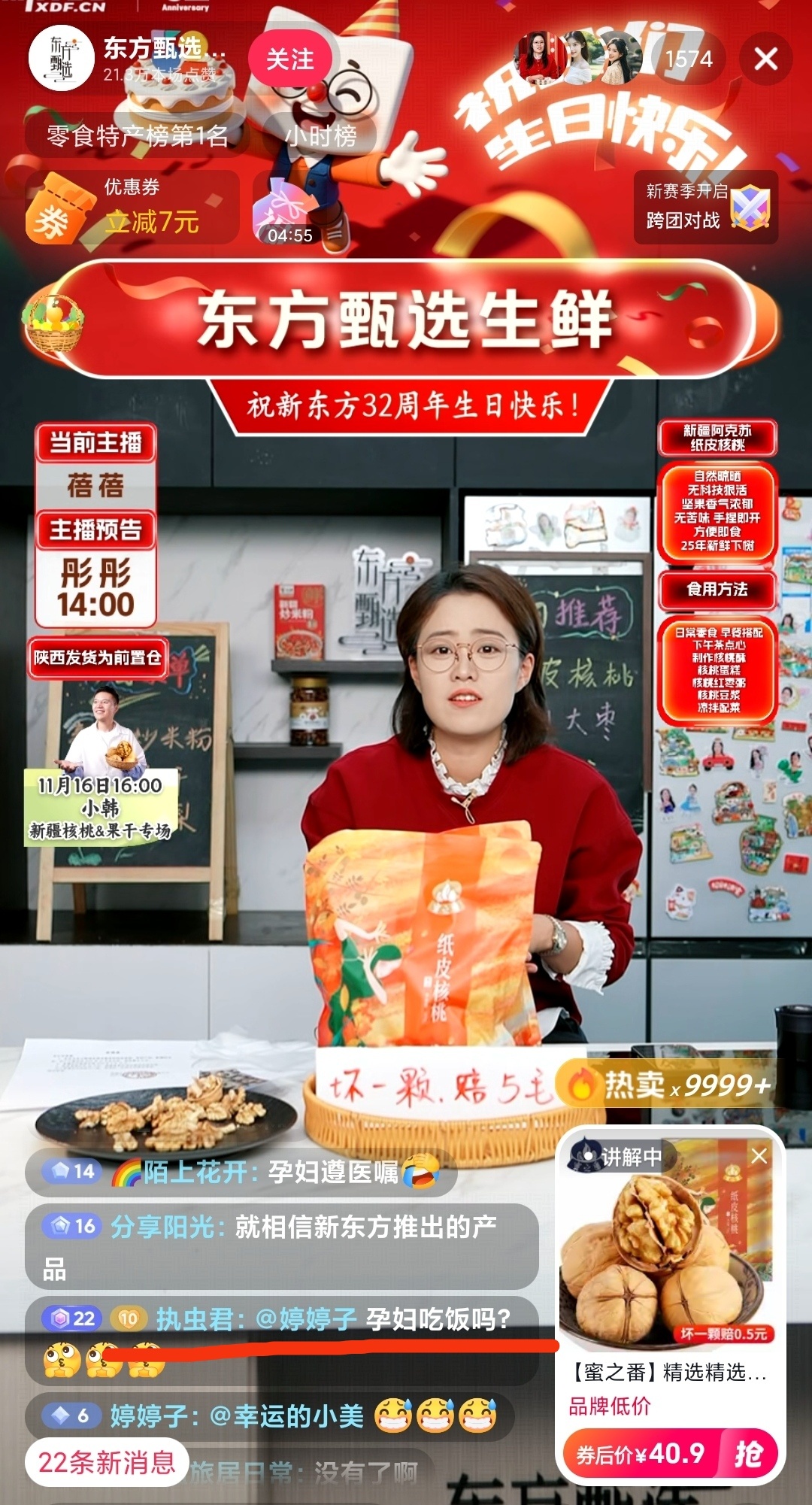 $东方甄选(HK|01797)$ 刷到知性优雅的才女主播蓓蓓在直播卖核桃,评论区有人问孕妇能吃吗,蓓蓓非常优雅、温柔、友好地回复:每到我的场就有很多新号进来找事儿!评论区的粉丝也赶紧跟上,非常热情、友善、关心地回复:孕妇吃饭吗?多吃点核桃,祝你胎儿大脑发育! 多么美好的直播间啊!