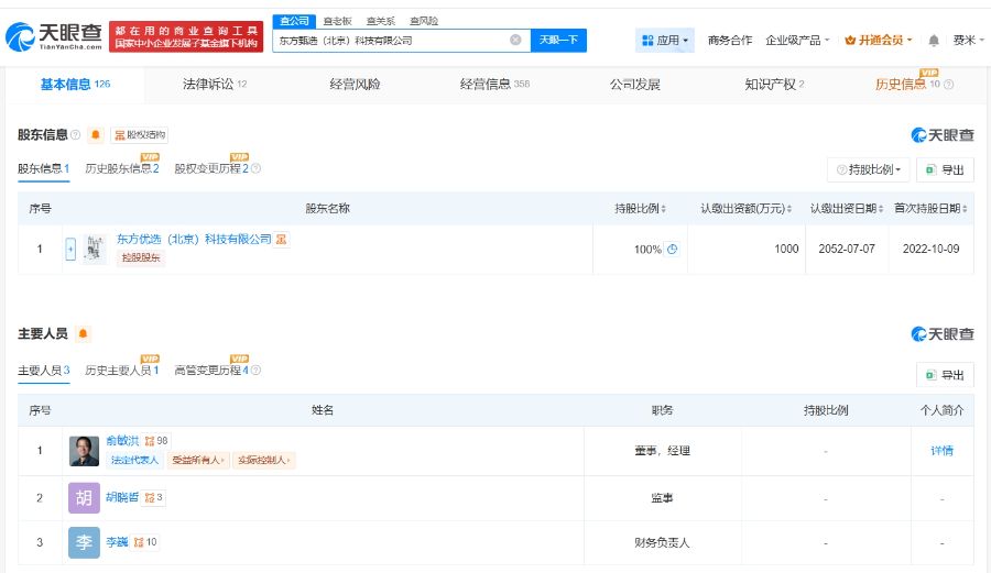 天眼查APP显示,近日,东方甄选(北京)科技有限公司发生工商变更,孙东旭卸任法定代表人、经理、执行董事职务,由俞敏洪接任。目前,东方甄选科技母公司东方优选(北京)科技有限公司尚未发生变更,孙东旭仍为法定代表人、执行董事、经理。