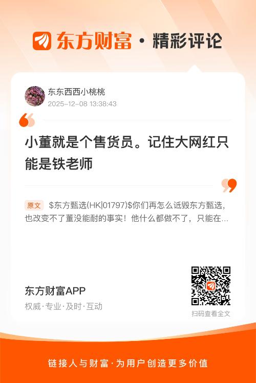 $东方甄选(HK|01797)$ 你们再怎么诋毁东方甄选,也改变不了董没能耐的事实!他什么都做不了,只能在抖音直播间卖卖货。一个网红,而且是最没用的网红!人家别的网红都是自己努力,一点一点的积攒起来的流量,展现了头脑和能力!而董,完全是靠东家的平台才被看哪里人多就去哪里、精神没有依靠的董个球们捧起来的!