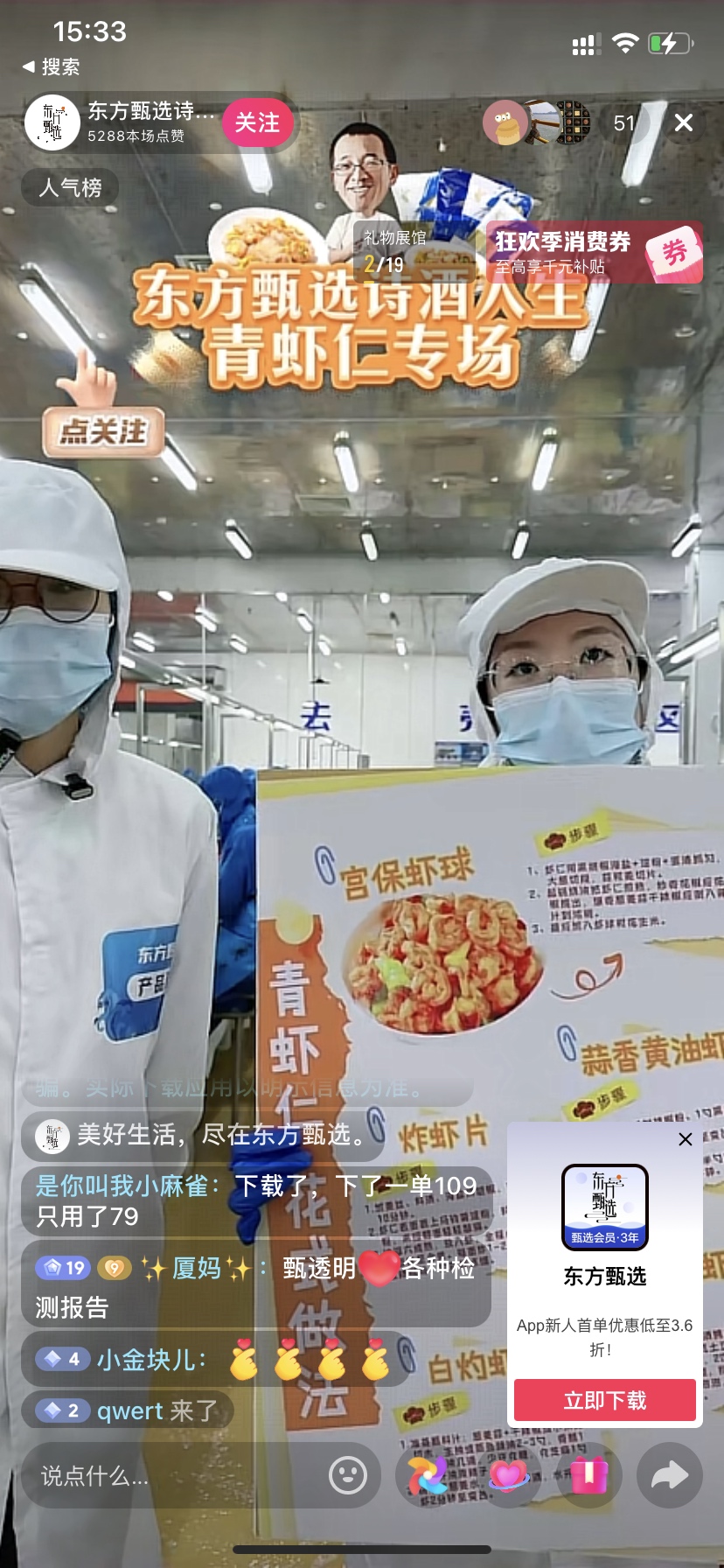 $东方甄选(HK|01797)$ 大家一起举报东方甄选违规引流。东方甄选诗酒人生,主播说“去东方甄选app购买这款青虾仁,立减30元”。