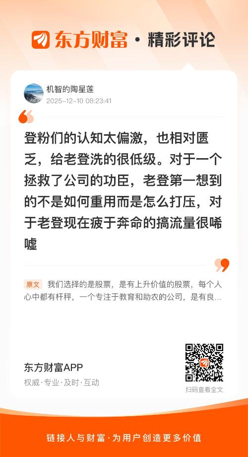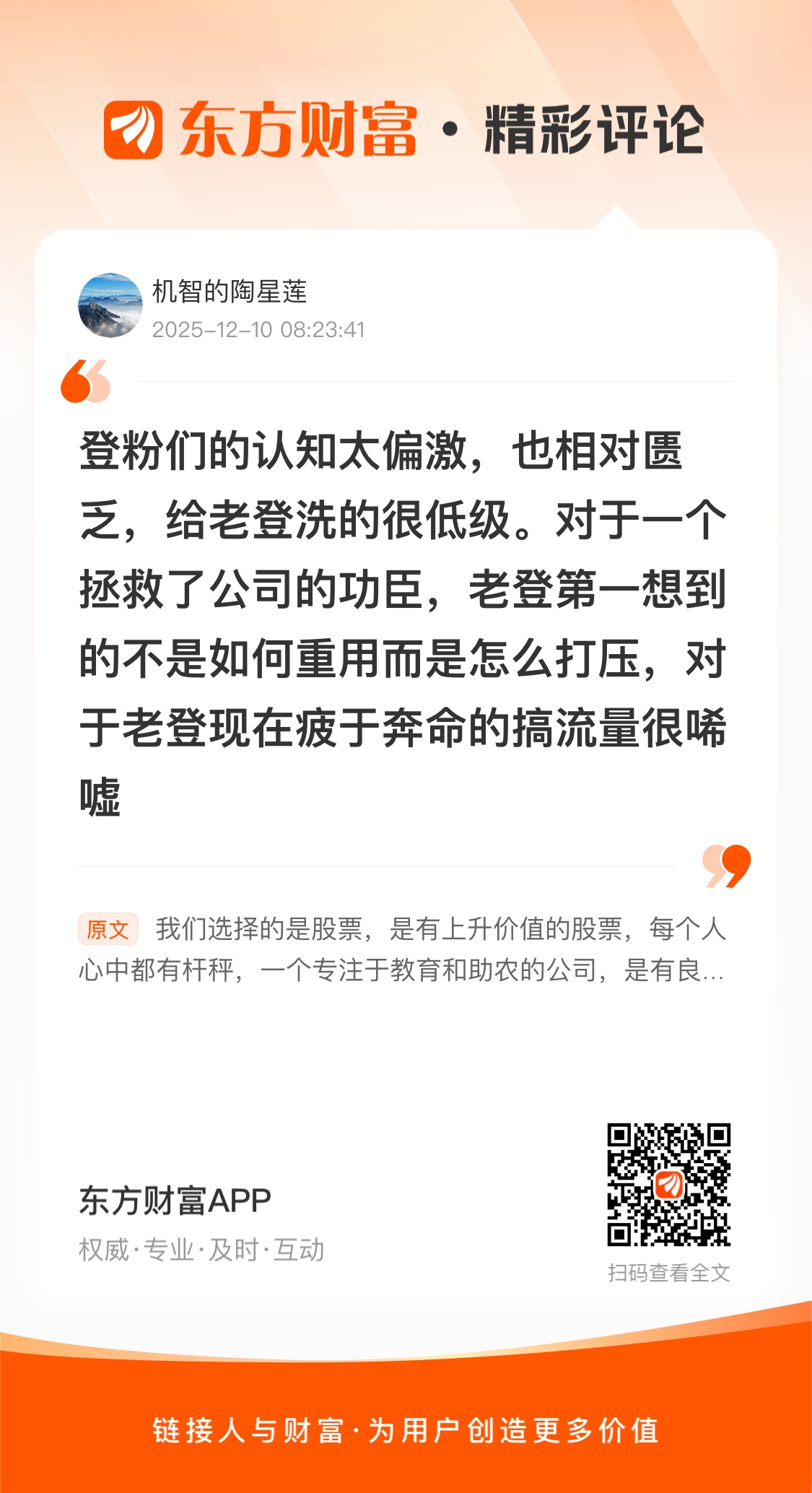 我们选择的是股票,是有上升价值的股票,每个人心中都有杆秤,一个专注于教育和助农的公司,是有良心的企业,国家停止校外培训,俞总也没有因此拖欠一分钱工资,也没有就此消沉,这样的人是值得尊敬的。对于董宇辉,相当于郭德纲的曹云金,相当于刀郎的云朵,相当于董明珠的孟羽童,走不远的!热度过了,也就那样了