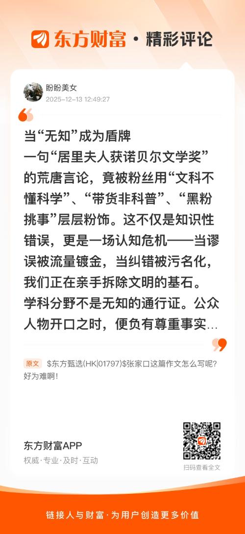 //@盼盼美女 : 当“无知”成为盾牌一句“居里夫人获诺贝尔文学奖”的荒唐言论,竟被粉丝用“文科不懂科学”、“带货非科普”、“黑粉挑事”层层粉饰。这不仅是知识性错误,更是一场认知危机——当谬误被流量镀金,当纠错被污名化,我们正在亲手拆除文明的基石。学科分野不是无知的通行证。公众人物开口之时,便负有尊重事实的基本责任。将居里夫人颠沛流离、以身殉科学的壮丽史诗,扭曲成张冠李戴的噱头,这是对真理的亵渎。“带货”绝非传播谬误的挡箭牌。任何面向公众的言说,真实性是其不可逾越的底线。若允许为流量而牺牲事实,我们将沉沦于“”的信息荒原。那些被斥为“挑事”的纠错者,实则是信息时代的守望者。他们的“较真”,是对抗认知退化、守卫公共理性的最后防线。若连这微光都要掐灭,我们将集体步入蒙昧的黄昏。粉丝的辩护,暴露了娱乐至死年代最危险的病症:用功利消解真实,用立场绞杀事实。当错误被宽容、无知被纵容,人类数百年构筑的知识大厦,终将在流量的狂欢中悄然倾覆。要娱乐,但不要愚昧;可带货,但不可带歪认知。这不仅是底线,更是文明存续的命脉。
