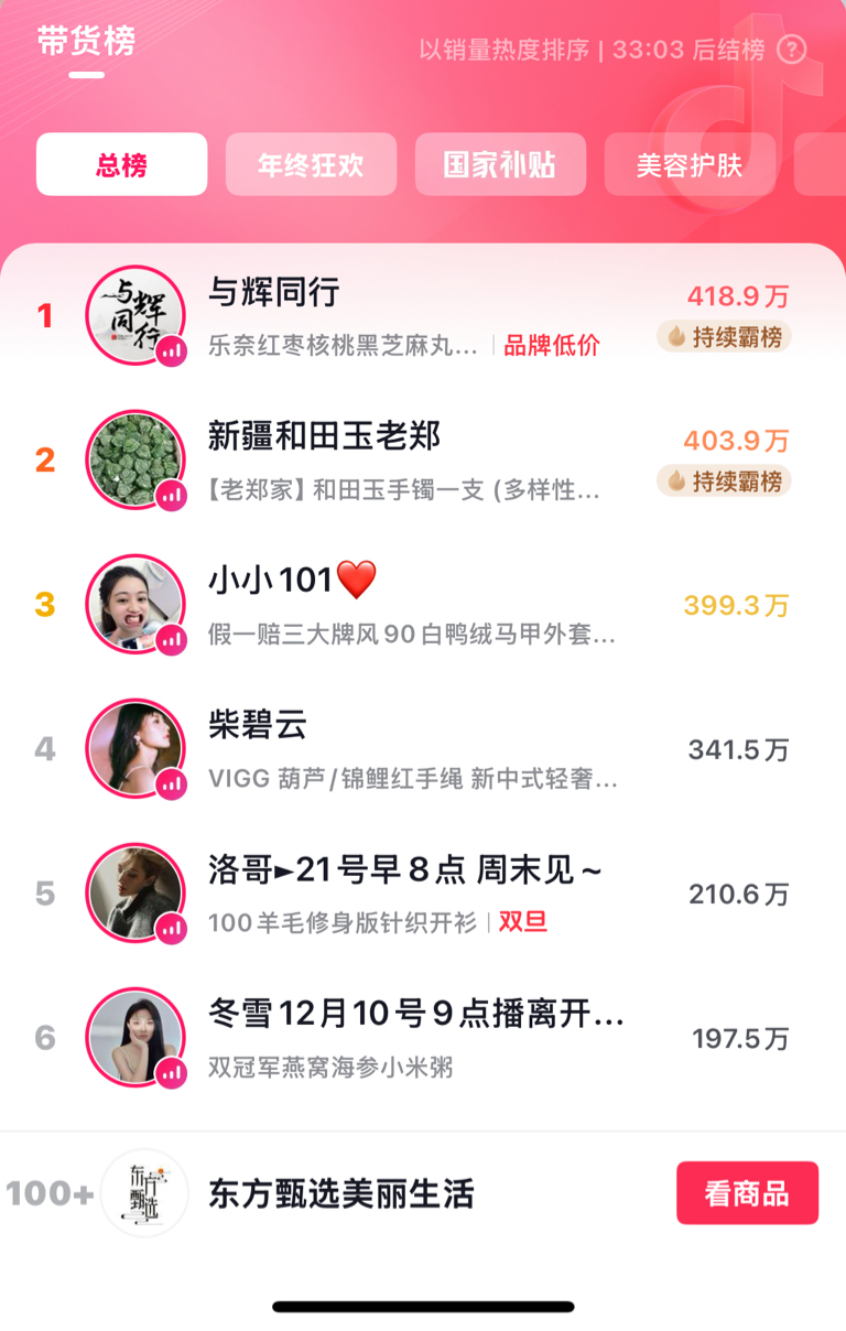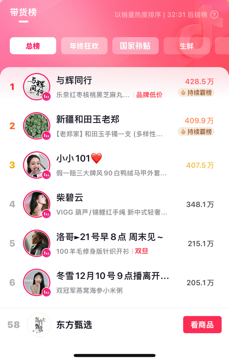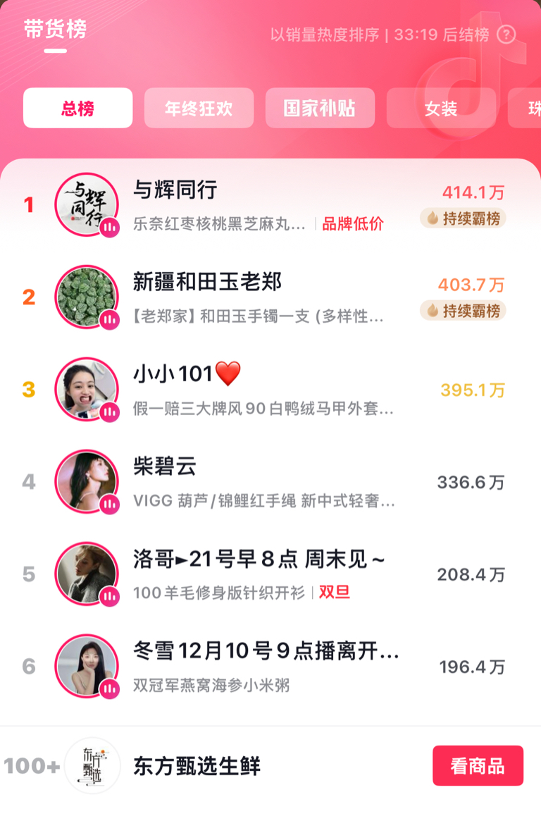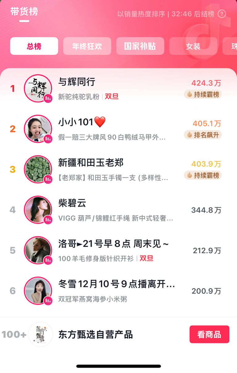 东方甄选只有一个号上榜,排名58,其他全是100+自营号:FirstBlood美