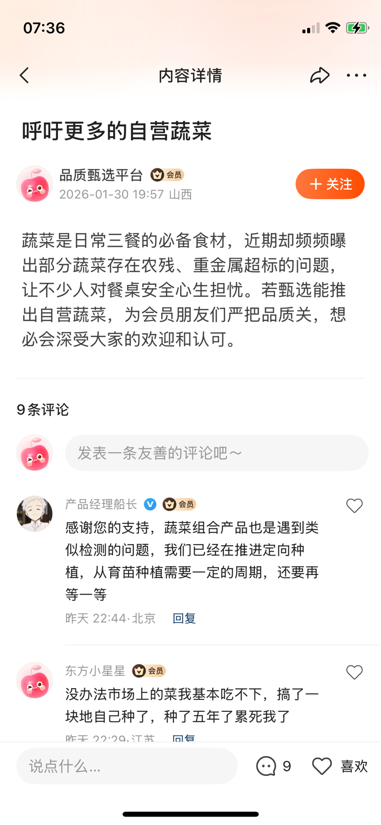 原本计划1月底上架的蔬菜组合因为检测不过关要延迟上架了,这就是当下食品安全现状与甄选的坚守。为保证安全,甄选决定对高危蔬菜选择定向包地种植合作模式。从育苗环节开始到种植到上架全程保证品质,确保农残重金属合格!这就是甄选为什么是食品安全的标杆!