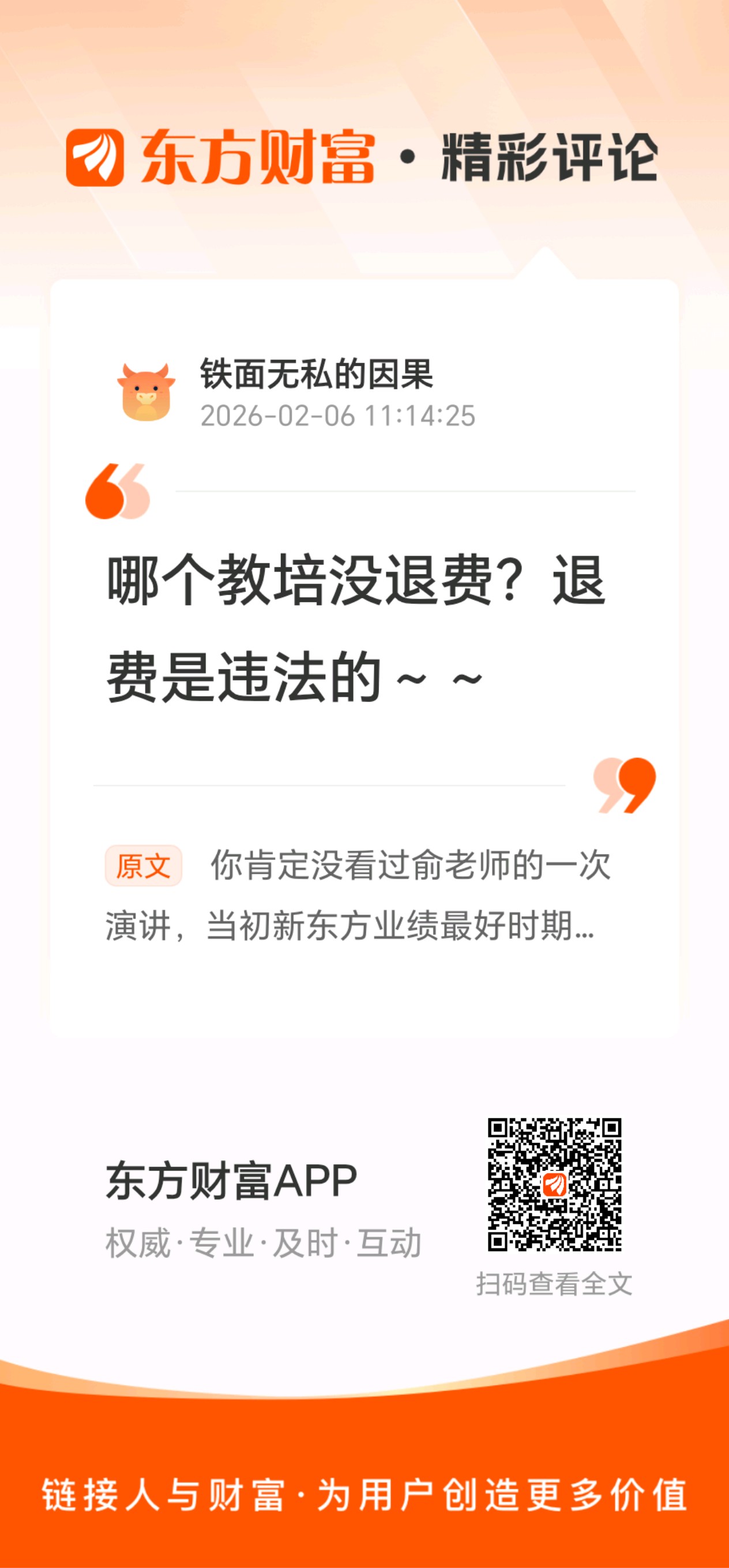 优胜教育跑路了你知道吧。中公教育承诺考不上退费,哈尔滨电视台多次报到一个家境极其困难的女孩遭遇不退费,区教育局出面也不行,多搜搜它家不按约定退费的帖子。双减对新东方这可是一次彻底的灾难,不可抗力,全部退费,全部N+1给年轻的员工们,就问你如果不是你们入了董的饭圈,回到那个时间你们对俞老师怎么评价?还像现在这样毫无底线的诋毁吗!人但凡有点逻辑适当反思一下,不会这样无底线//@长期主义出奇迹 :你肯定没看过俞老师的一次演讲,当初新东方业绩最好时期,账上很多钱时大股东也要求分红但是俞老师坚持账上必须有足够的钱,才有后来双减有足够资金给员工N+1和退回家长们的费用,课桌椅送山区也需要运费的。也是支撑东方甄选的成立底气他做好了五年亏损五亿的准备,得到股东支持,才有了现在的甄选