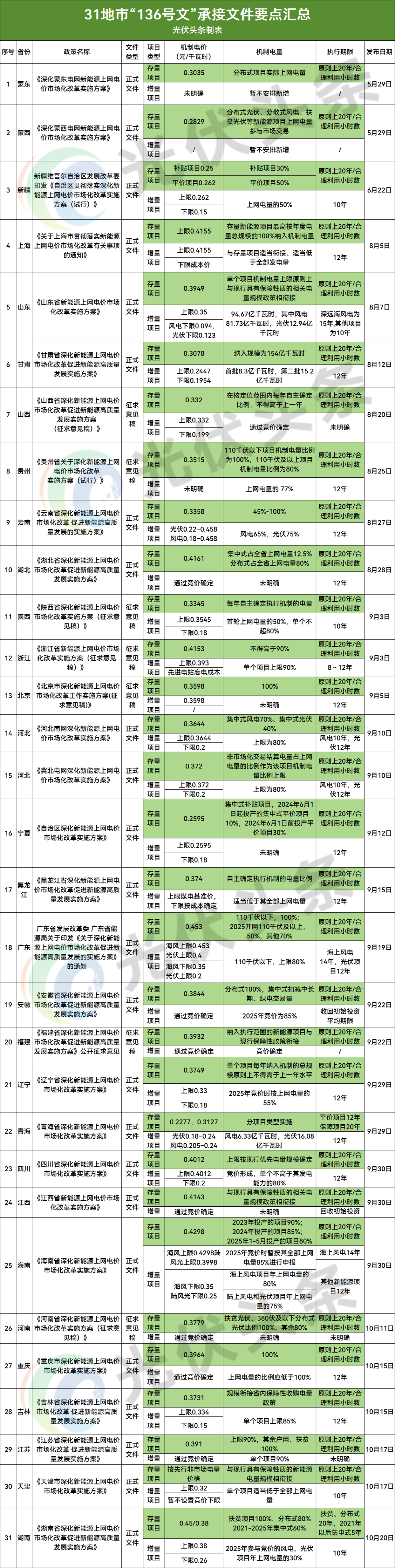 各地市执行136号文存量及增量电价统计对比