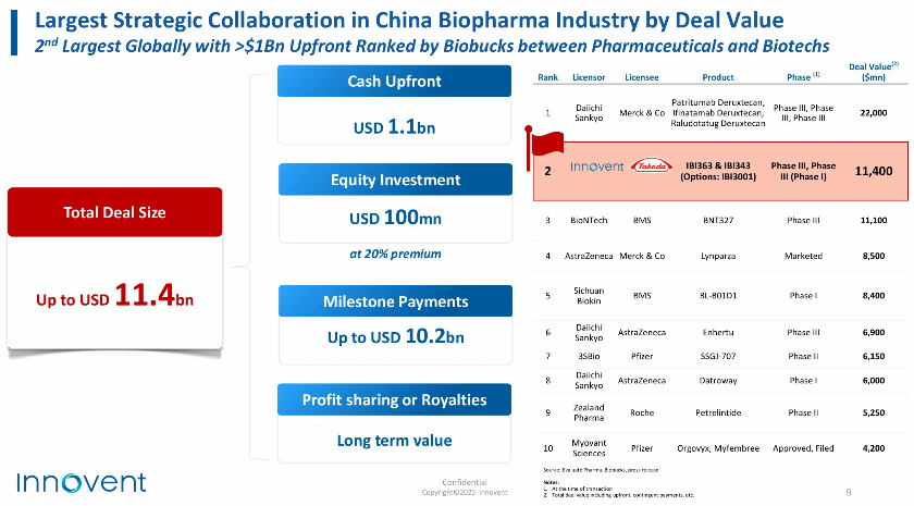 界面新闻从信达生物业务沟通会上获悉,这成为中国生物制药行业最大一笔战略合作。该总额在首付款超过10亿美元的交易中也位列全球第二,仅次于第一三共与默沙东关于三项后期ADC(抗体偶联药物)的交易。