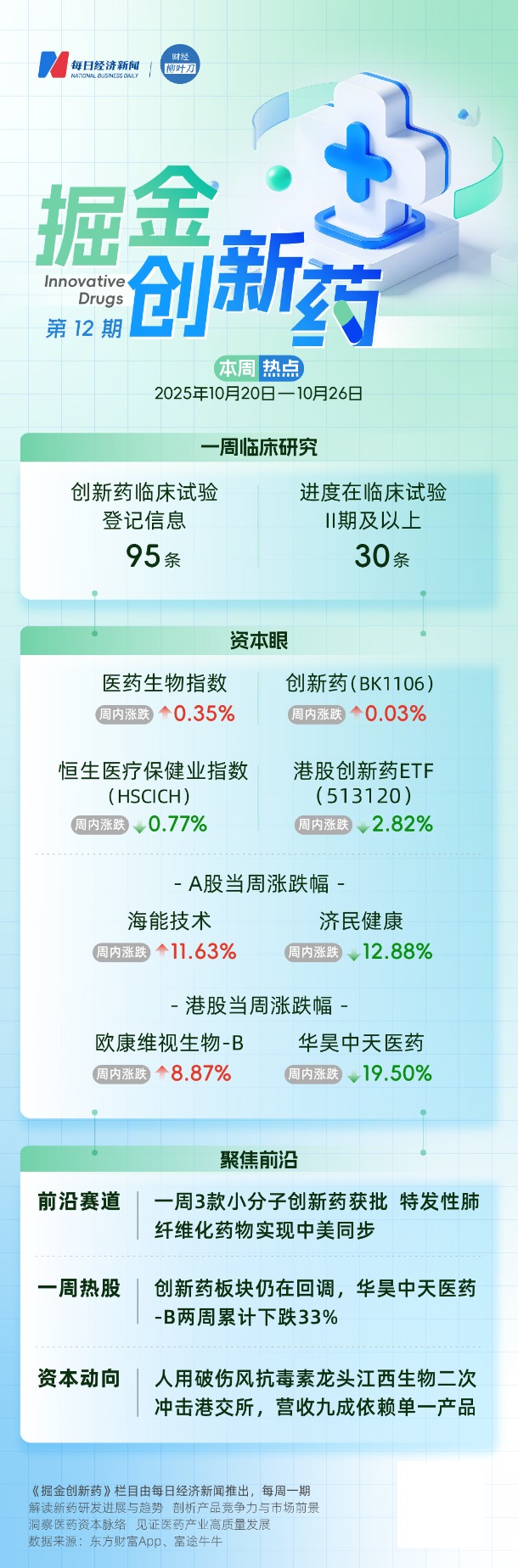 10月20日至10月24日,医药生物指数上涨0.35%,跑输上证指数0.36个百分点,连续五周跑输上证指数。创新药(BK1106)周内微涨0.03%,结束持续四周的下跌行情。恒生医疗保健业指数(HSCICH)周内下跌0.77%,虽较上周跌幅收窄,仍处于下行趋势,部分前期涨幅较大的个股下跌明显;港股创新药ETF(513120)周内下跌2.82%,周内的2025年欧洲肿瘤内科学会年会(ESMO)利好、信达生物大金额BD(商务拓展)交易未能带动行情。