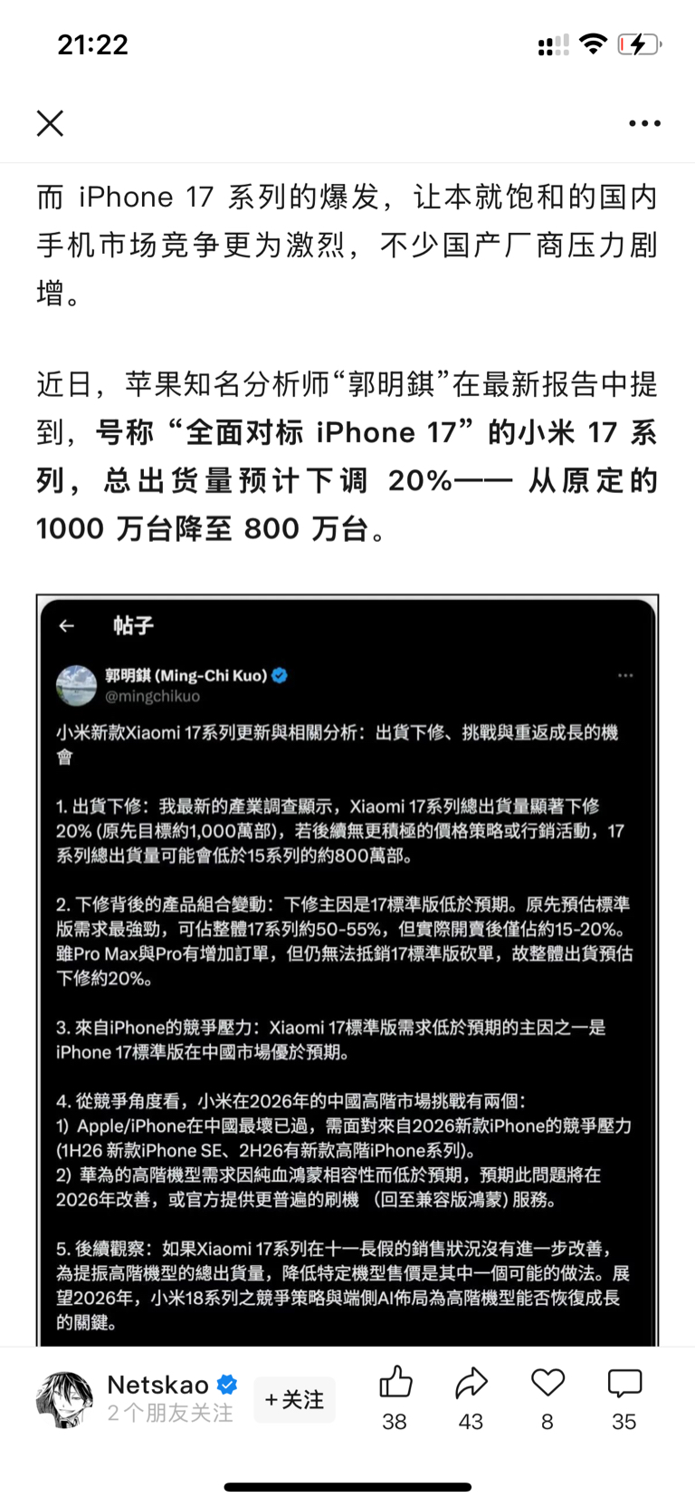 $小米集团-W(HK|01810)$ 本轮下跌的原因之一,搜iPhone17文章很容易找。另一个原因就是“汽车一个零件一个零件抄”,这一轮25%起步,别挣扎了