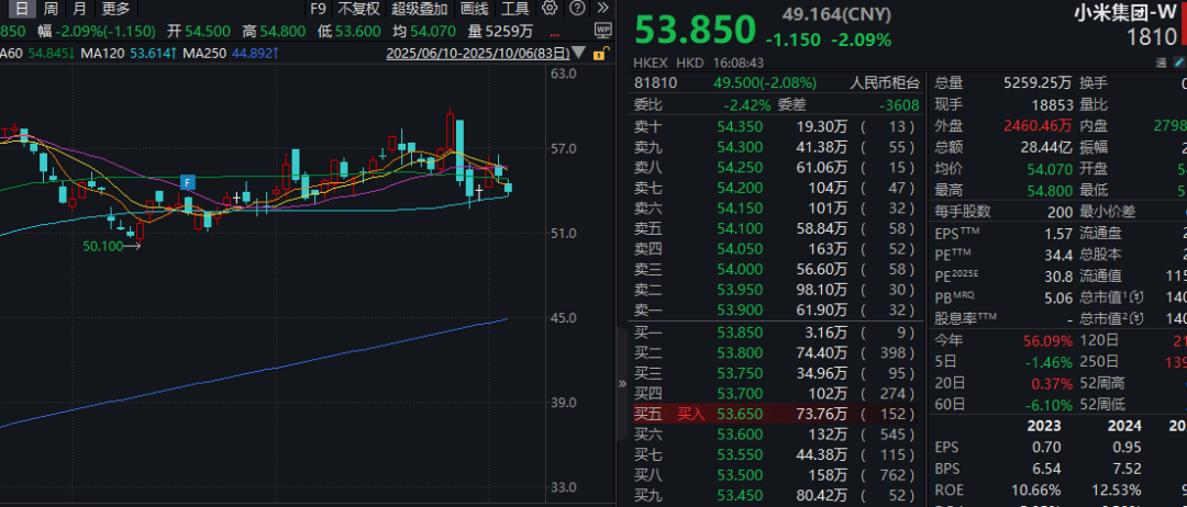 股票市场上,在港上市的小米集团-W近期走势相对低迷,10月6日小米集团-W股价下跌2.09%,报53.85港元。