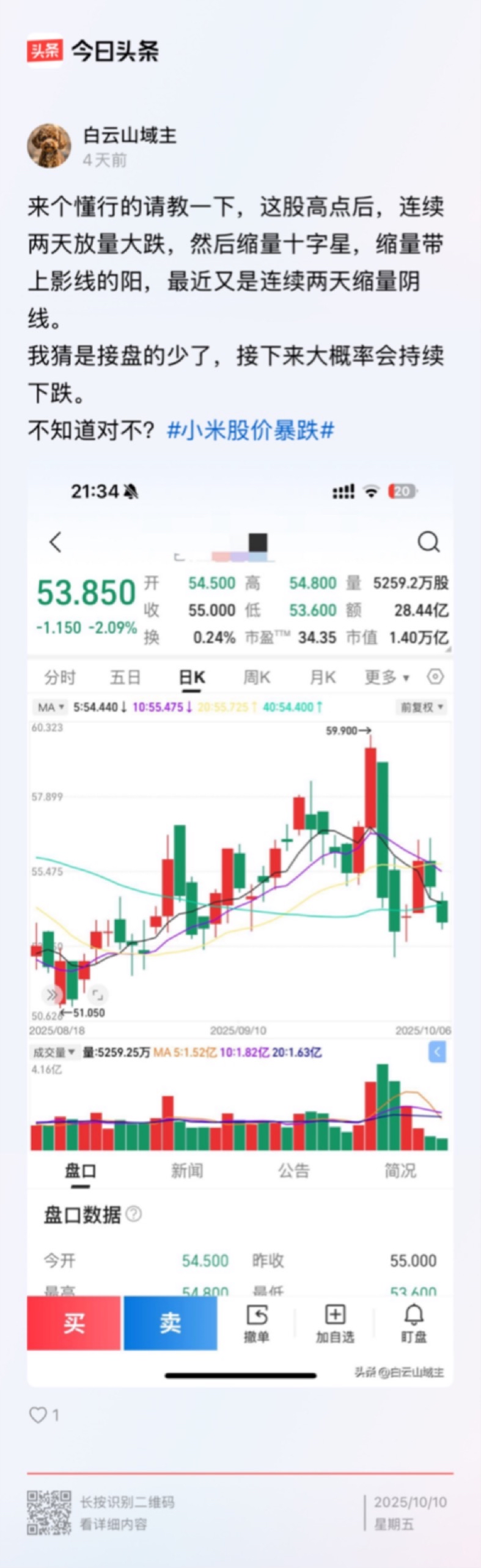 我最近分析水平可能有点提高。我10月6日分析小米股票会继续下跌,看来还挺准。不过