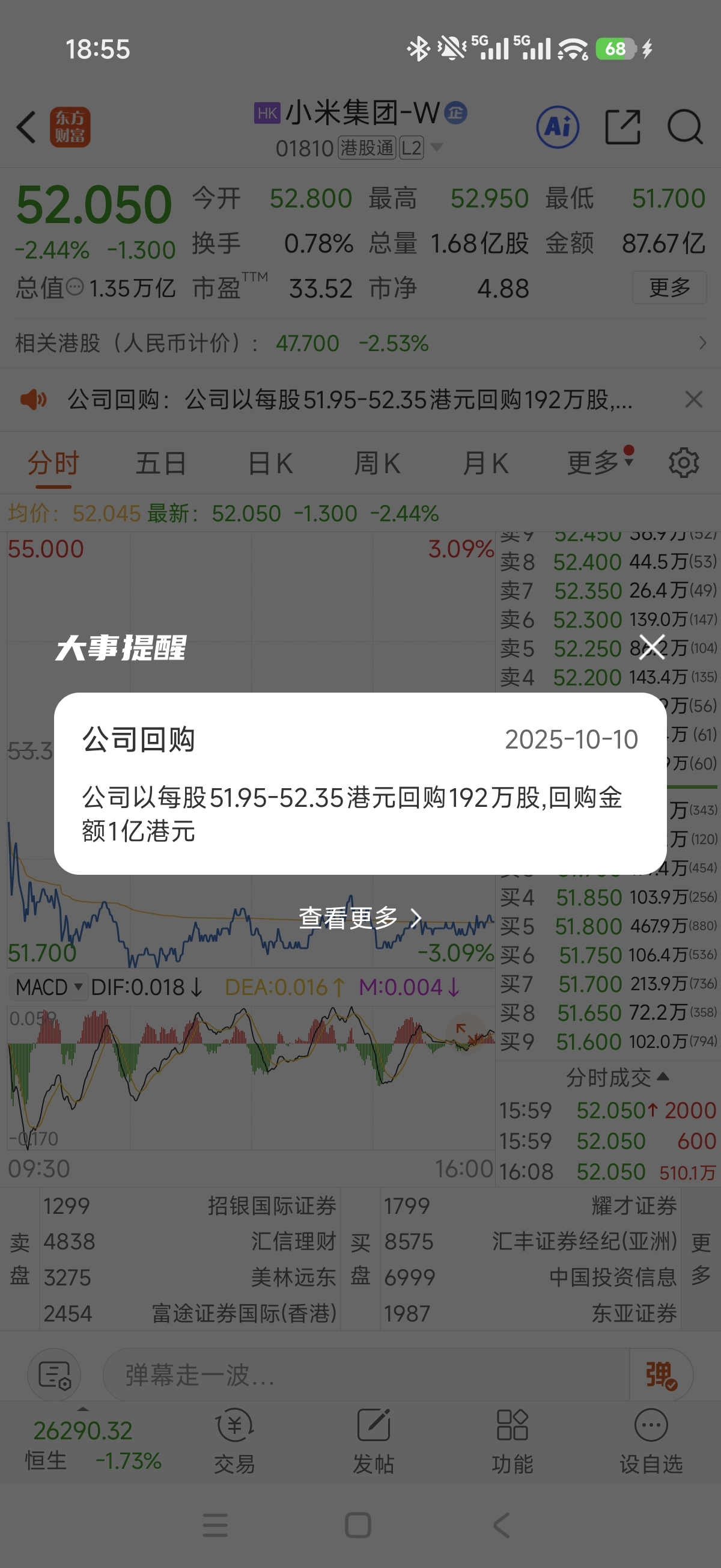 $小米集团-W(HK|01810)$ 今天回购了一个亿。