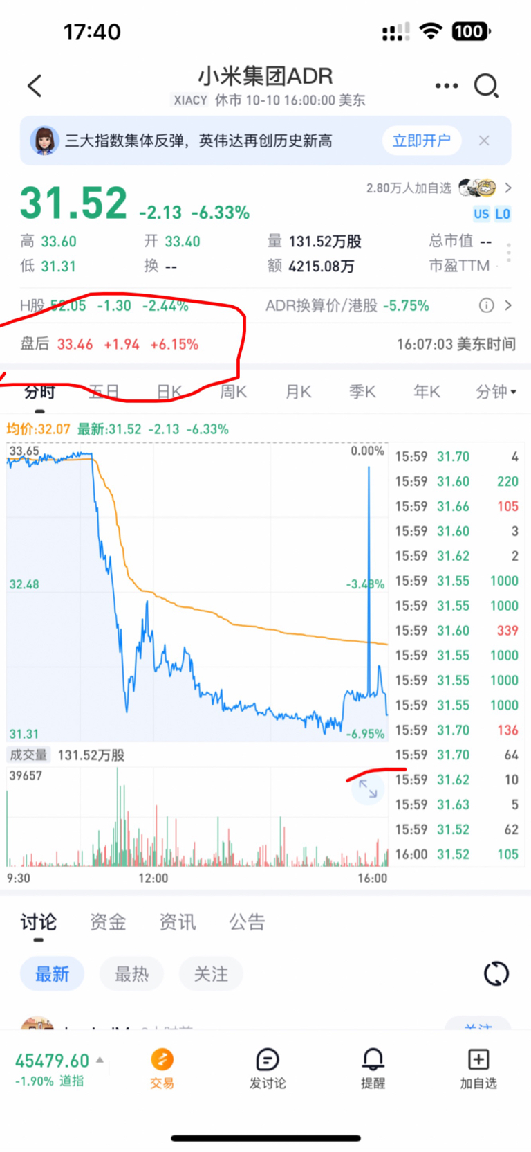 $小米集团-W(HK|01810)$ 盘后又涨回来了,而且有人在疯狂吸筹