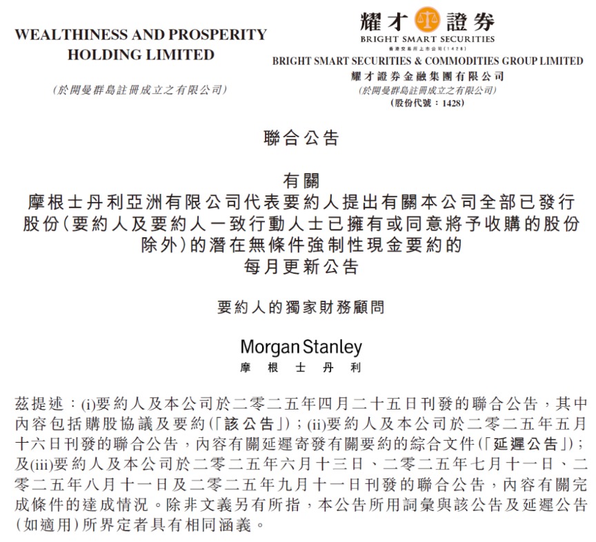公告表示,要约人已向国家发改委提交申报材料,并一直积极与其进行沟通。与国家发改委就收购事项的相关流程正按计划推进中。要约人及耀才证券将继续推进完成条件的达成。