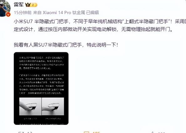 2024年1月28日雷军在微博中说:“小米SU7半隐藏式门把手,不同于早年纯机械结构‘上翻式半隐藏门把手’!采用固定式设计,通过按压内部微动开关实现电动解锁,无需物理抬起就能开门。”