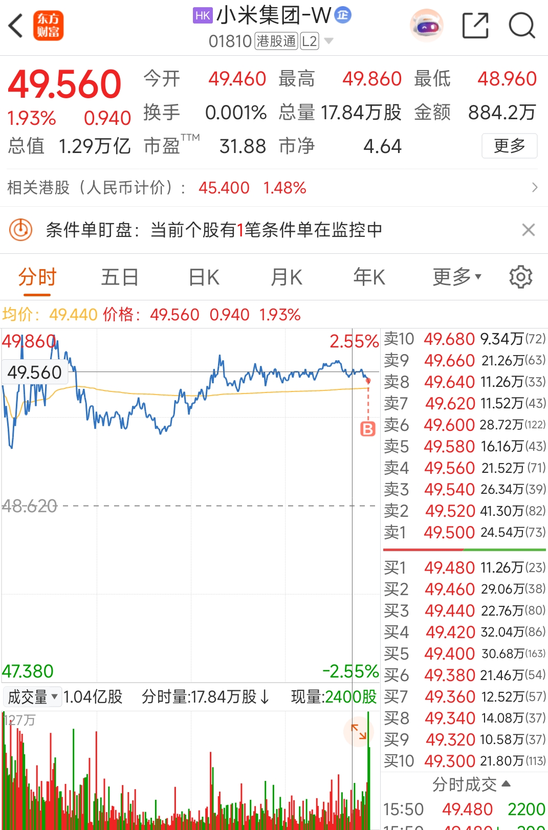 $小米集团-W(HK|01810)$ 不等了,49.5又买了点~_~
