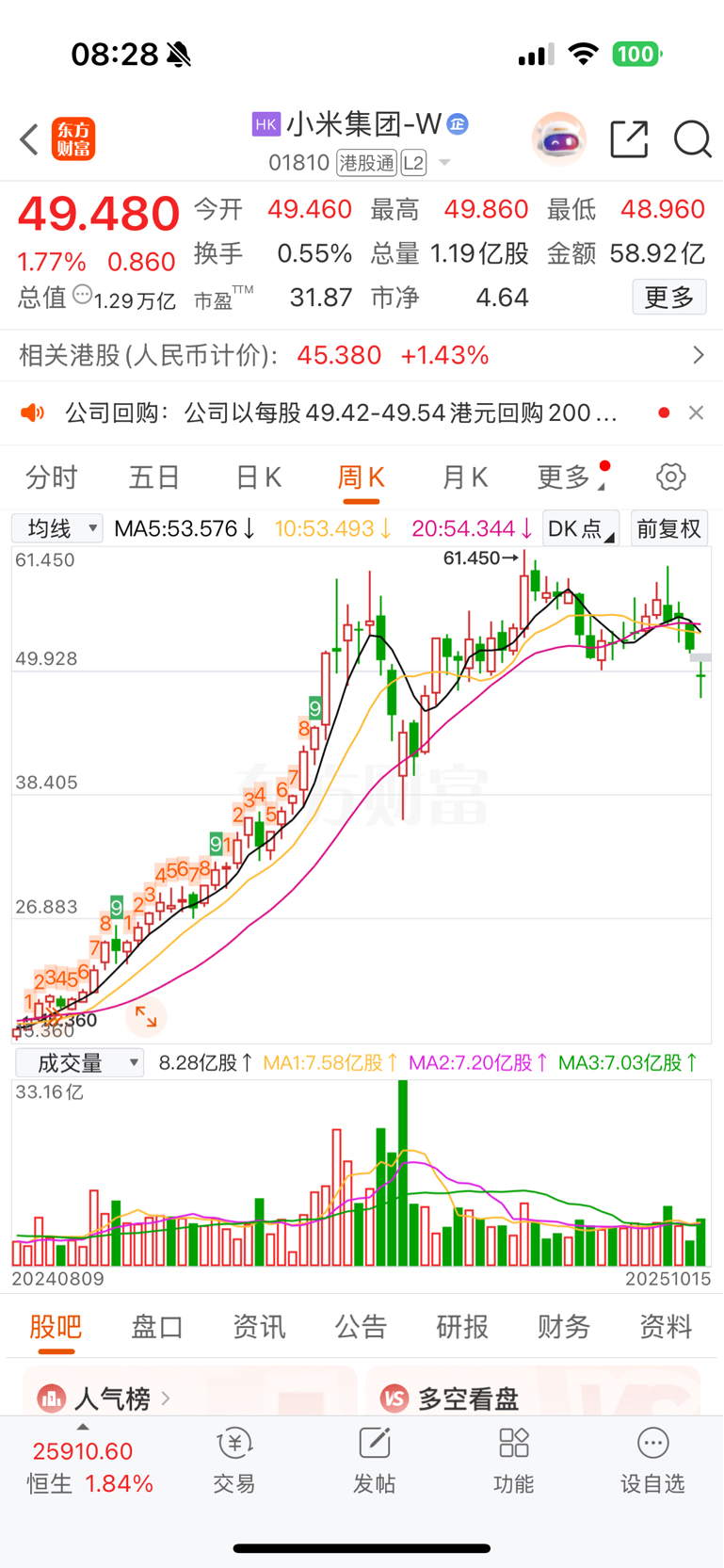 $小米集团-W(HK|01810)$ 周K线的形态不佳,一定要有动作了,不要倒在黎明前