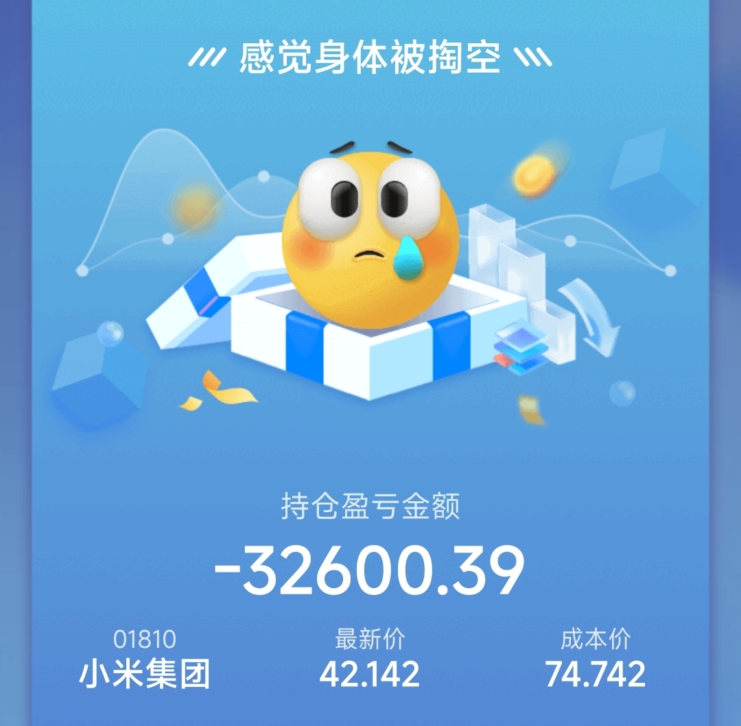 $小米集团-W(HK|01810)$ 今天没顶住下跌,把仓位换到金山云里面去了,结果还是大面一碗,小米还剩一千股,调仓后成本变成了七十多,唉,这个局该怎么破,真的顶不住了。
