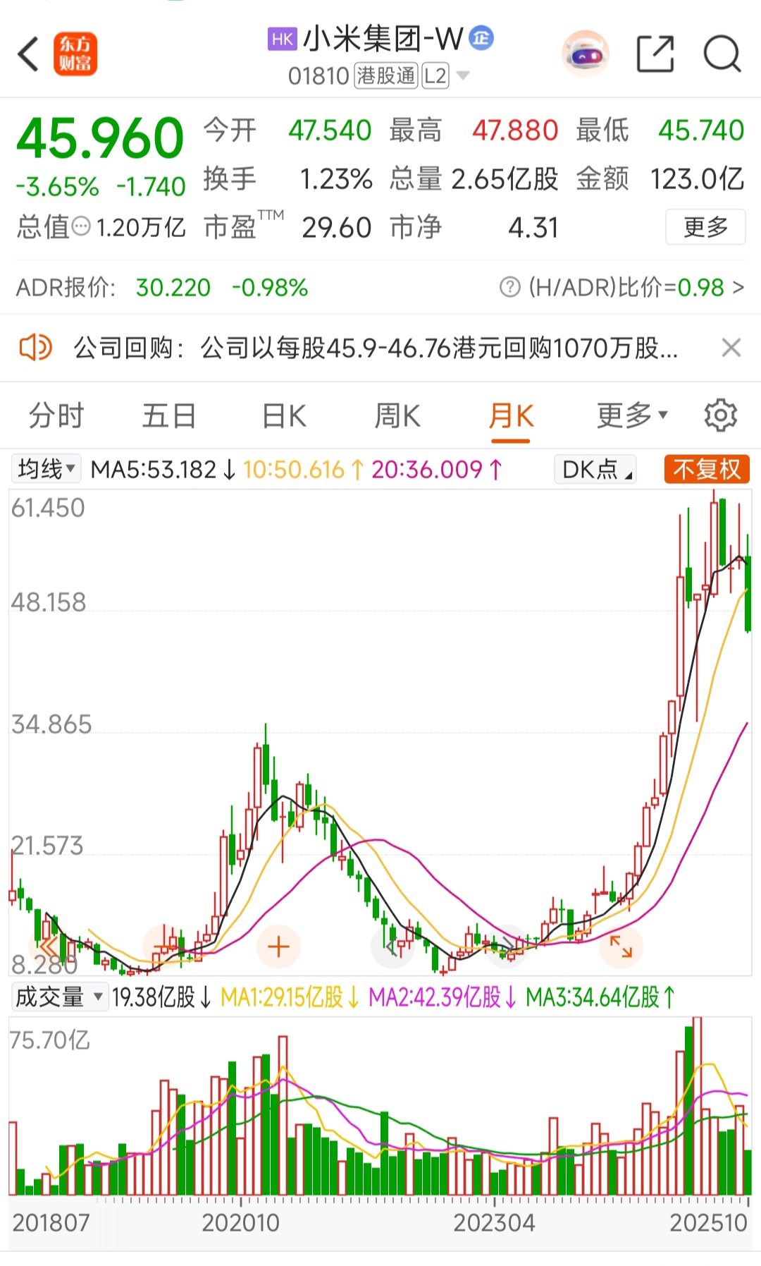 $小米集团-W(HK|01810)$ 上市到现在没有任何一次分红,从图形来看在这股上投资真正得到回报没几个,2020年股价就34块了,别总想着用最低价跟最高价做计算,很多人踩不准这个点位,跟何况没分红谁会投资铁公鸡,还有就是小米其实被大A牛市的风带起来的,加上汽车估值才会有今天这个价,现在汽车风评还有虚伪的一面别揭穿自然下跌回归最终市值估算