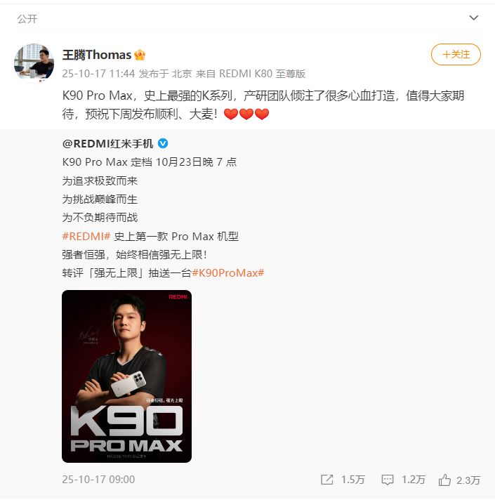 值得注意的是,10月17日前小米高管王腾Thomas转发红米手机官方推文并表示:K90 Pro Max,史上最强的K系列,产研团队倾注了很多心血打造,值得大家期待,预祝下周发布顺利、大麦!