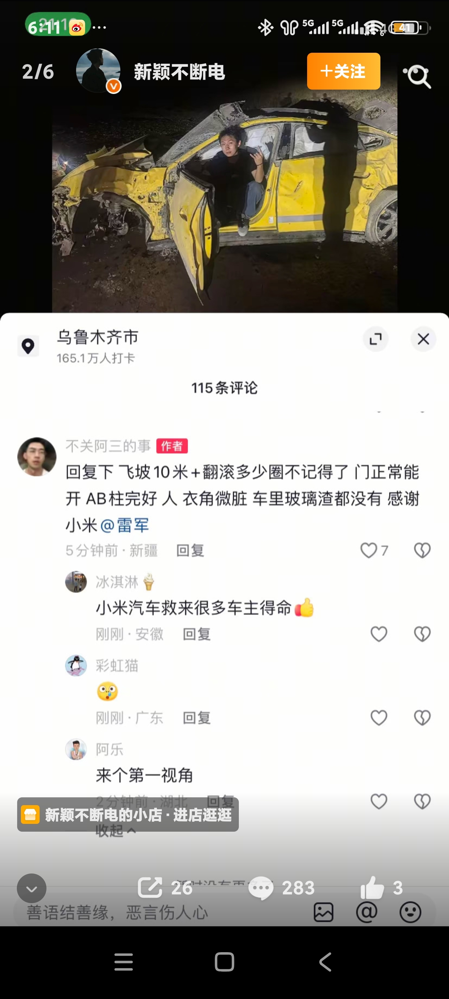 小米Su7 Ultra飞坡10米+翻滚多少圈不记得了,门正常能开,AB柱完好人衣角微脏车里玻璃渣都没有,全损60万,感谢小米。