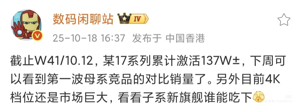 据站哥透露,截止W41/10.12,小米17系列累计激活137W±,另外4K档由