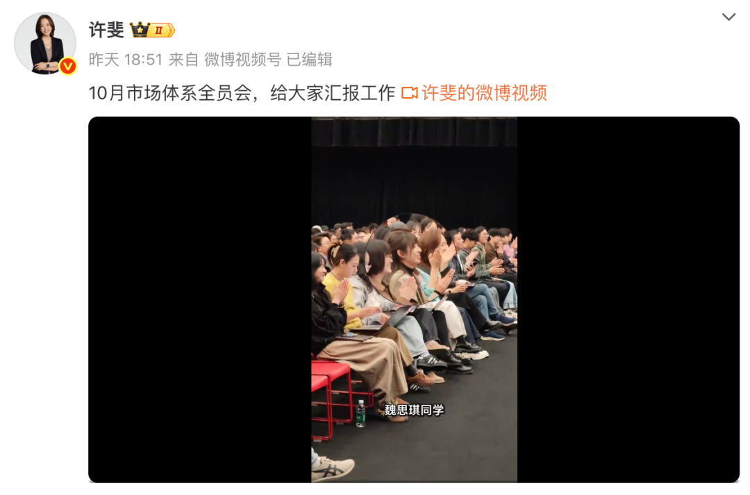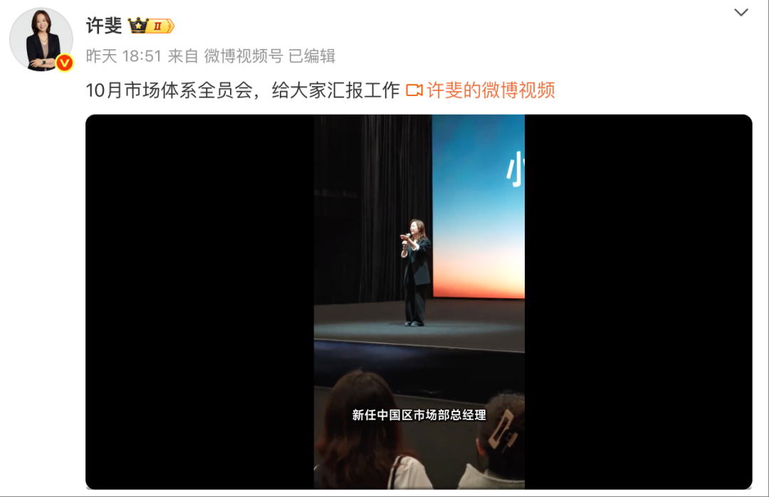 10月17日晚,小米集团副总裁、CMO许斐在社交媒体平台公布小米10月市场体系全员会的现场视频。在本次大会中,许斐称魏思琪为“新任中国区市场部总经理”。