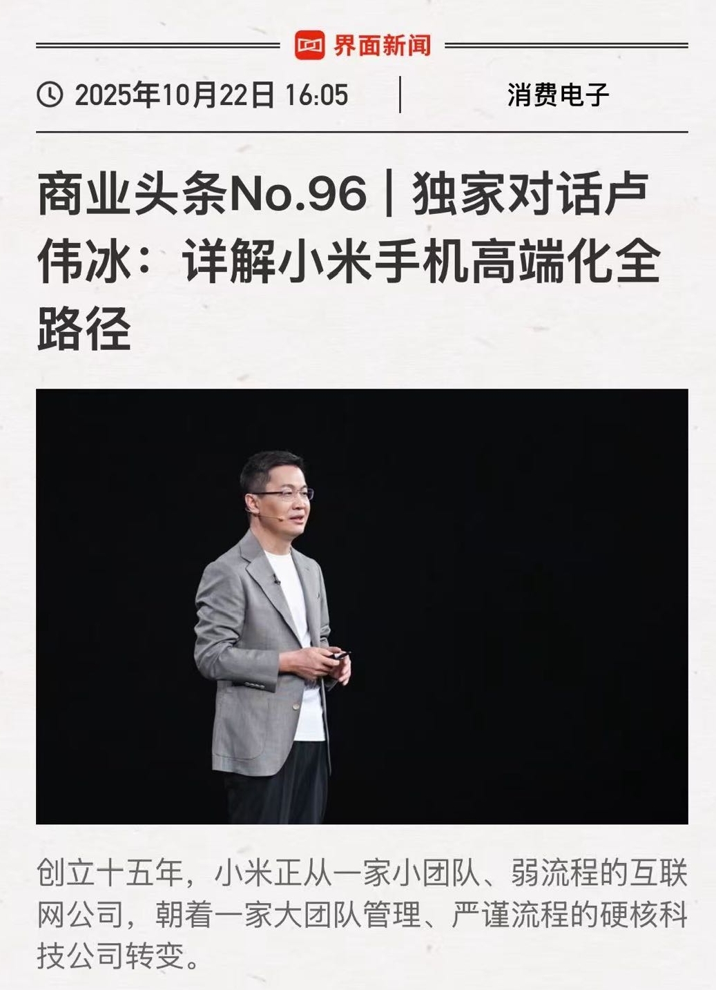 $小米集团-W(HK|01810)$ 都说小米是靠营销,看完这个访谈才知道小米有多牛,难怪智能制造、汽车、芯片全都能干成