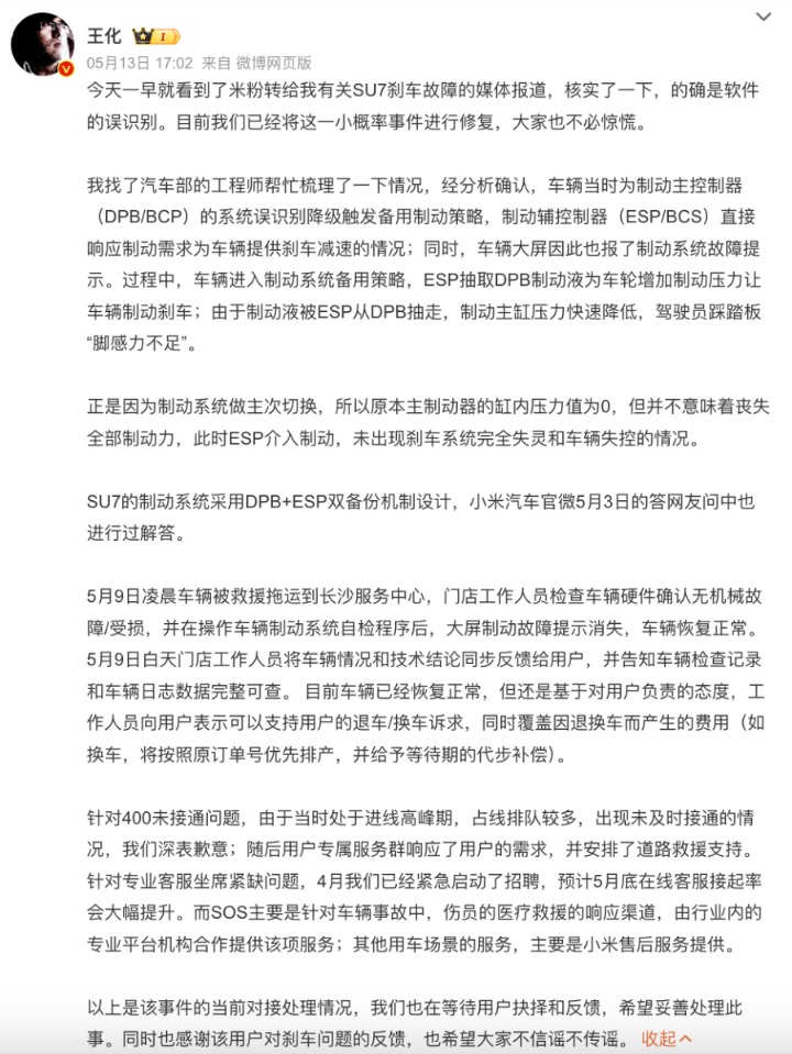 针对400未接通一事,王化表示,由于当时处于进线高峰期,占线排队较多,出现未及时接通的情况,我们深表歉意;随后用户专属服务群响应了用户的需求,并安排了道路救援支持。针对专业客服坐席紧缺问题,4月我们已经紧急启动了招聘,预计5月底在线客服接起率会大幅提升。而SOS主要是针对车辆事故中,伤员的医疗救援的响应渠道,由行业内的专业平台机构合作提供该项服务;其他用车场景的服务,主要是小米售后服务提供。