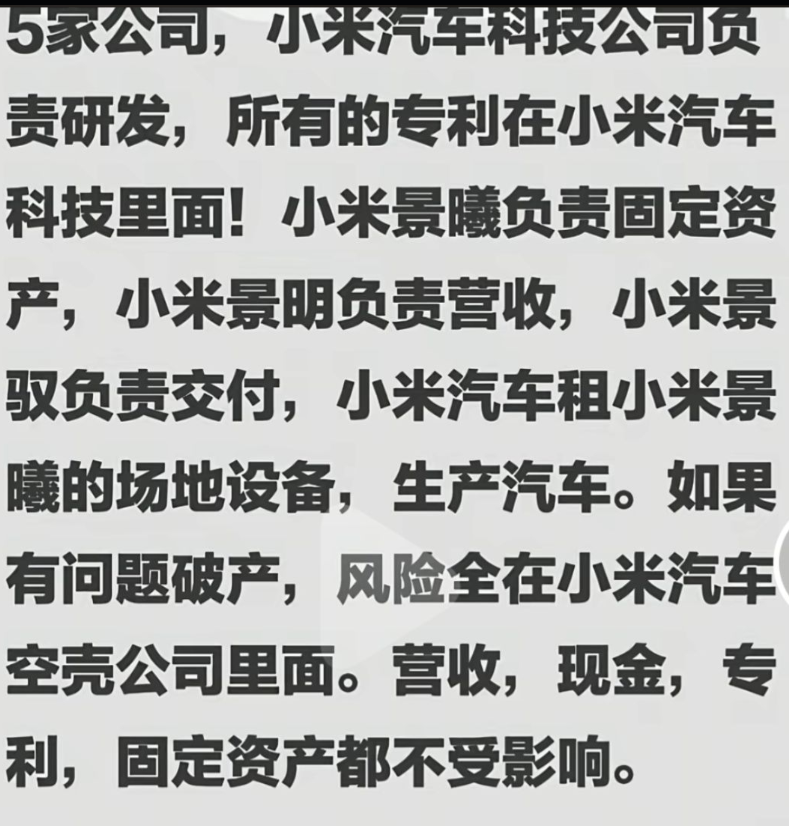 小米这操作牛啊,收钱的说自己不适格被告,卖车的说自己没收到钱也不合适,造车的说自己没参与营销也不合适,研发的说自己不造车也不合适...........有兴趣你们去看看小米答辩状,无敌的完美闭环!!!