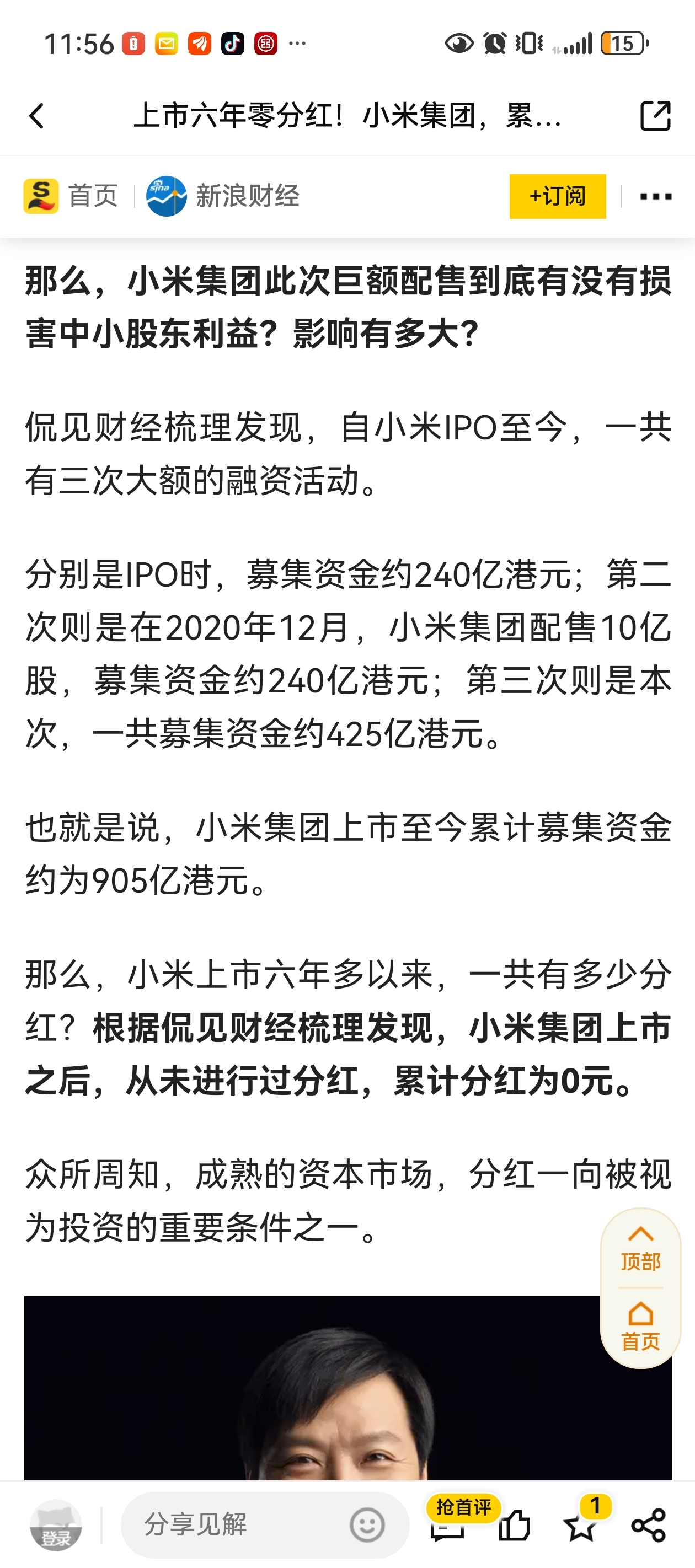 $小米集团-W(HK|01810)$ 上市6年融资905亿,0分红,雷总卖什么都有粉买单。