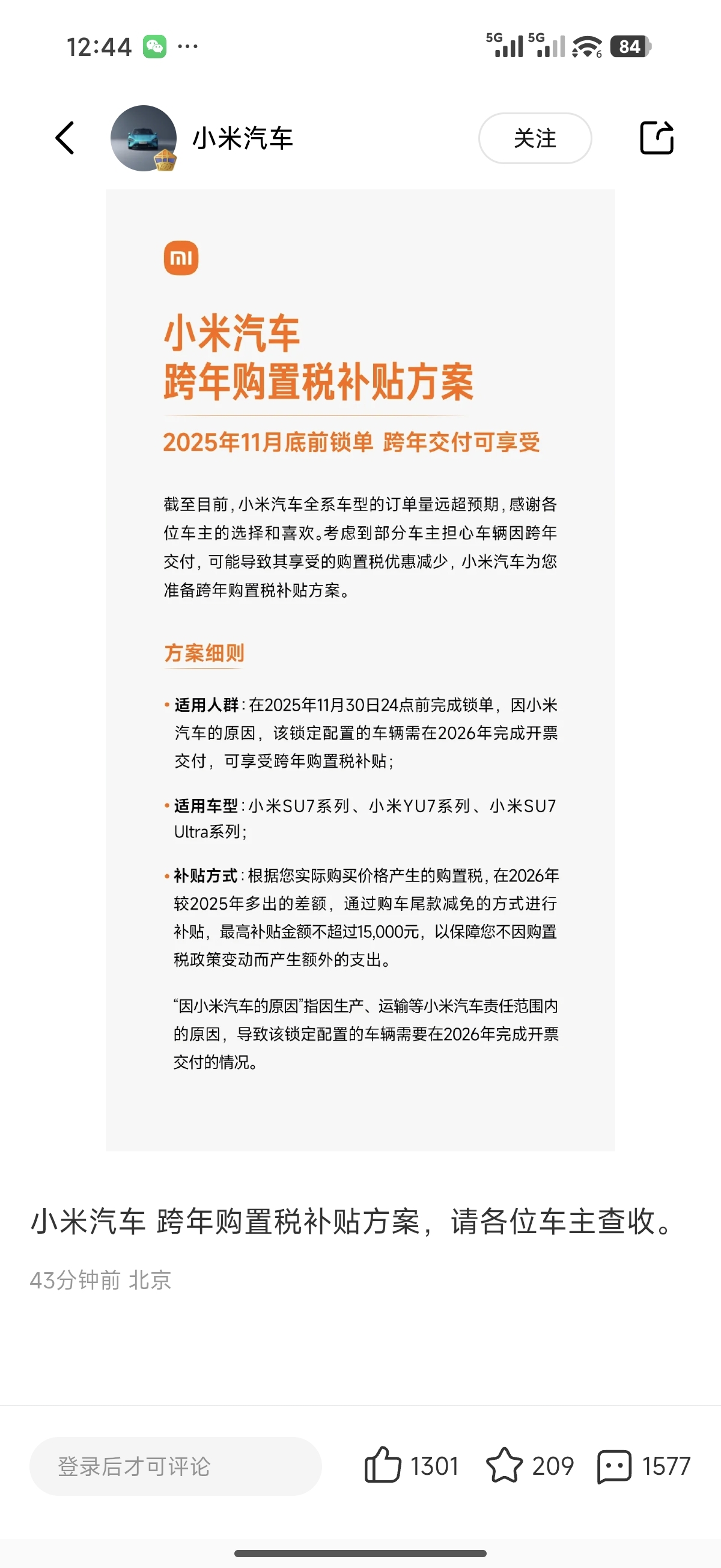【小米汽车】亲爱的准车主:您好!小米汽车全系车型的订单量远超预期,感谢各位车主的选择和喜欢。考虑到部分车主担心车辆因跨年交付,可能导致其享受的购置税优惠减少,小米汽车为您准备跨年购置税补贴方案。您可前往小米汽车APP-车辆交付页中查看细则。