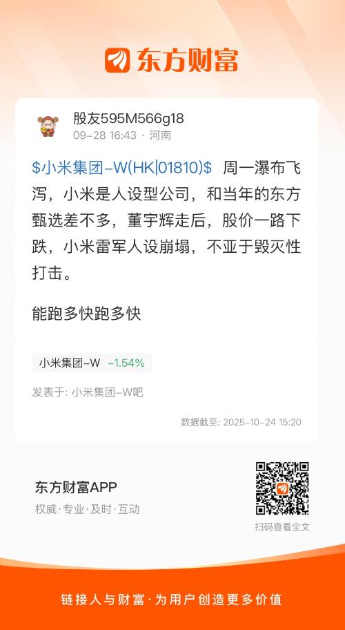$小米集团-W(HK|01810)$ 周一瀑布飞泻,小米是人设型公司,和当年的东方甄选差不多,董宇辉走后,股价一路下跌,小米雷军人设崩塌,不亚于毁灭性打击。