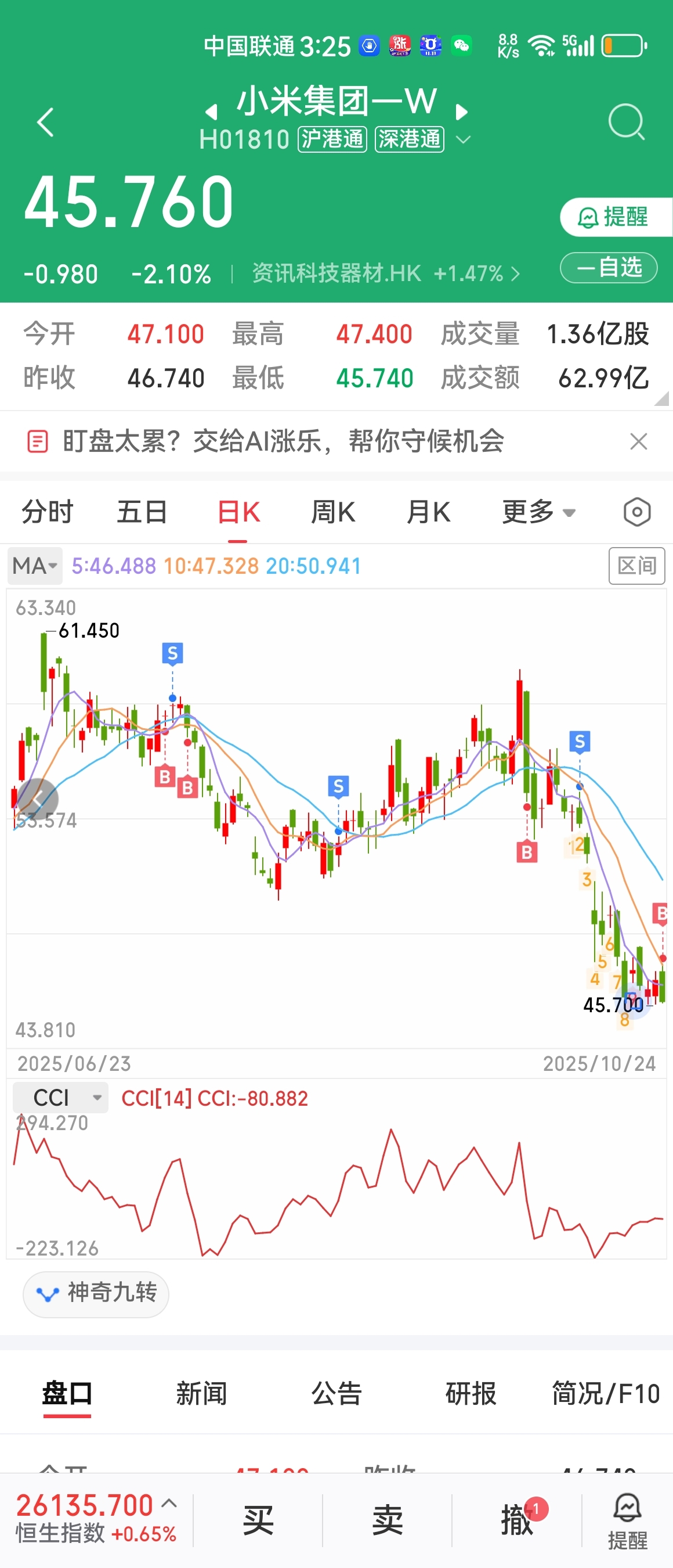 小米和我范冲,每次买小米,它都跌,割肉它就涨,小米亏六万多了,回回接飞刀