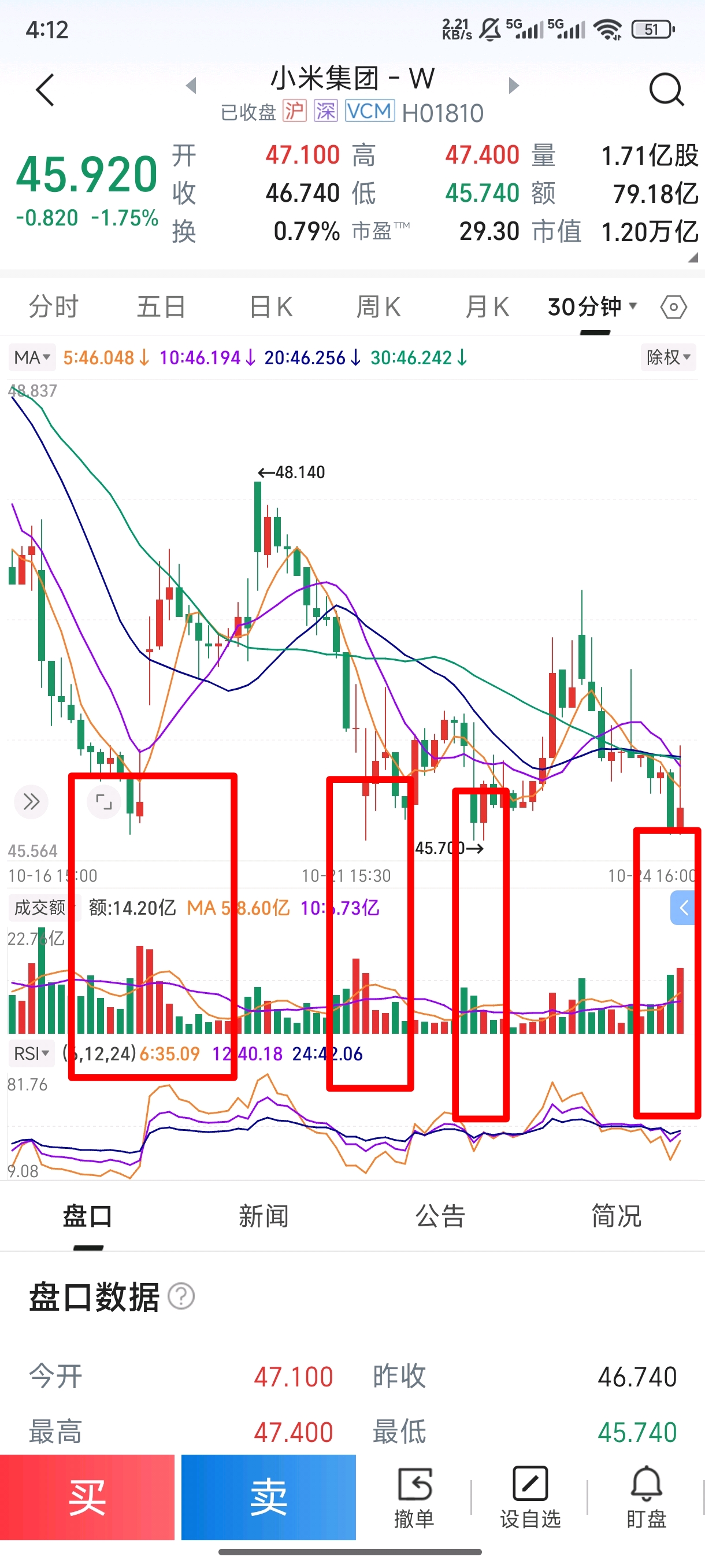 $小米集团-W(HK|01810)$ 连续四天在这里筑一个平台。45.7这个位置这么吗?低价+天量。。。到底是什么意思,是诱多还是诱空拭目以待。。子弹充足就等主力表演。