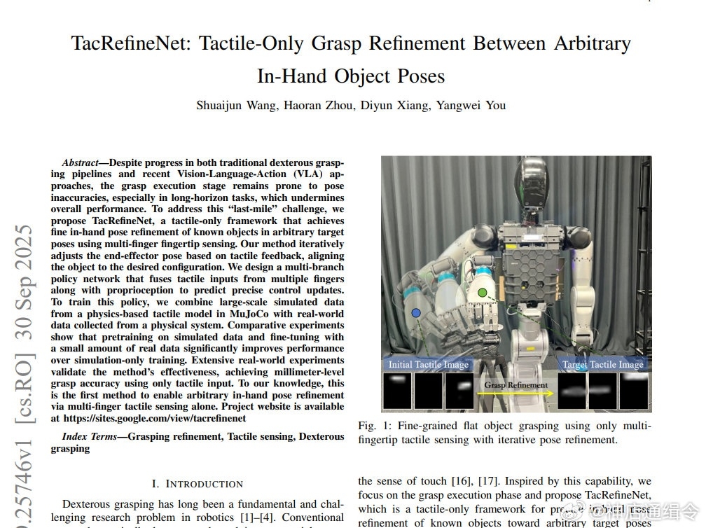 仅用多指触觉实现了毫米级的精细抓取,可以做到想怎么抓就怎么抓,而且抓的准,在“抓取最后一厘米”问题上向前推进了一小步。