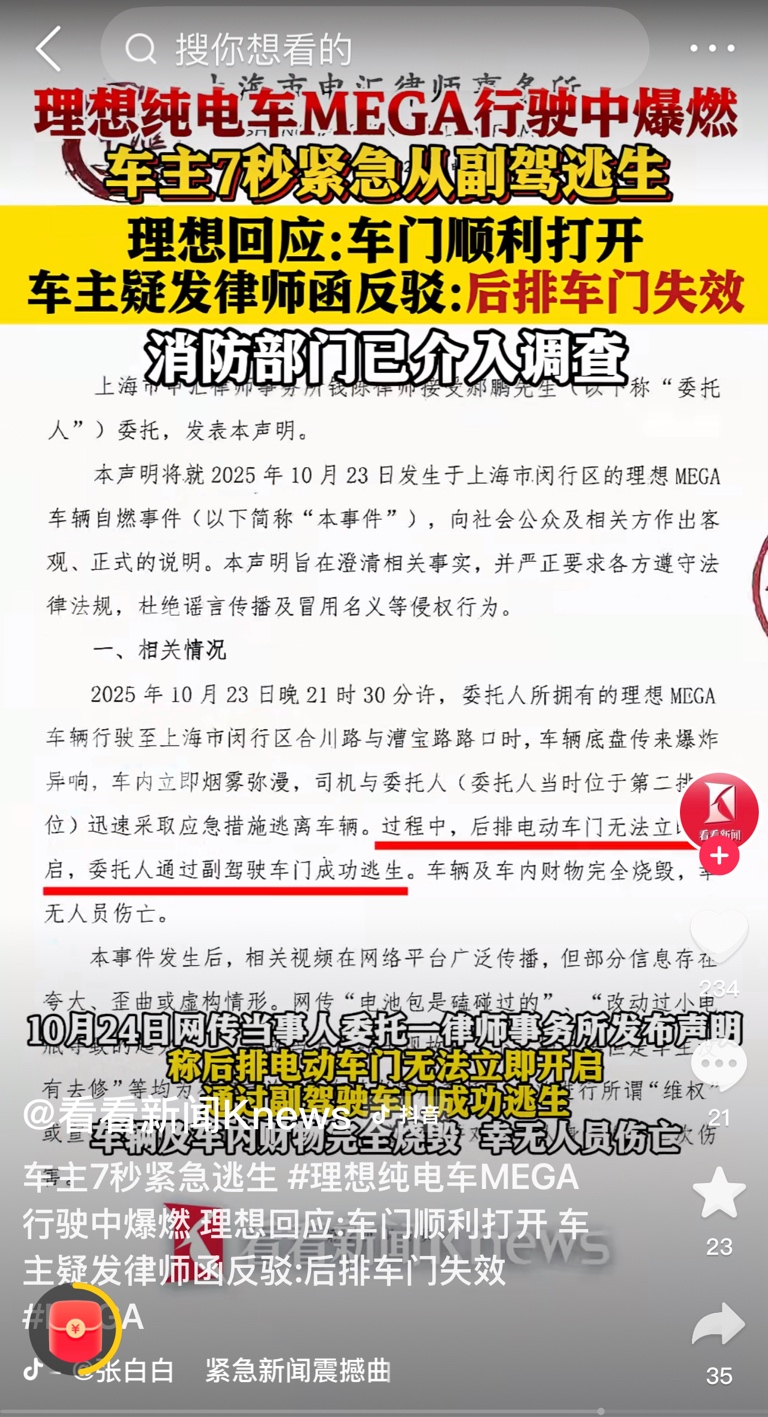 屁滚尿流君当时坐后面,证实燃爆的理想车后门也打不开。最后从前门爬出来屁滚尿流爬逃