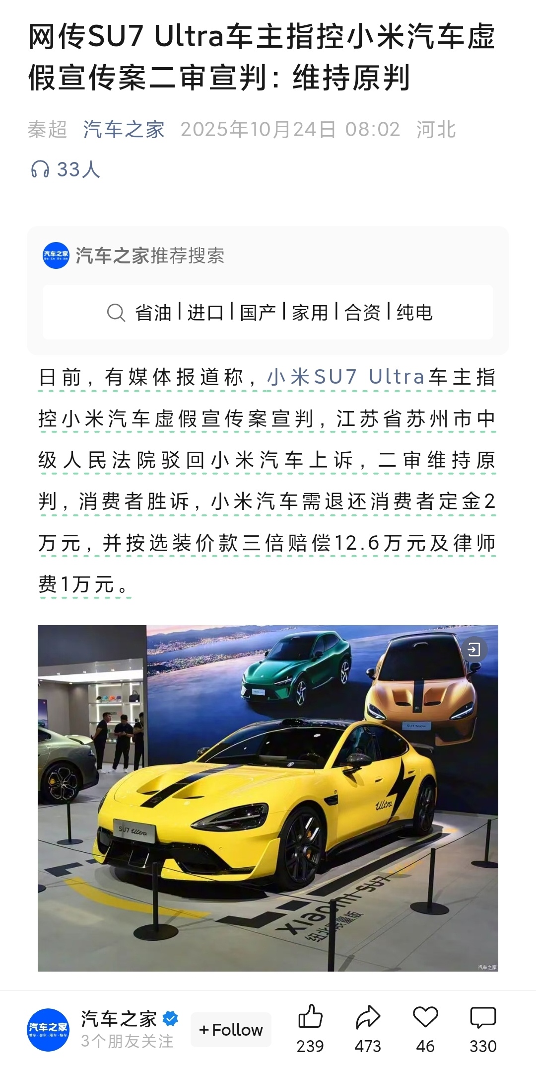 最新消息:SU7Ultra虚假宣传二审维持原判,退还定金2万元,三倍赔偿12.6