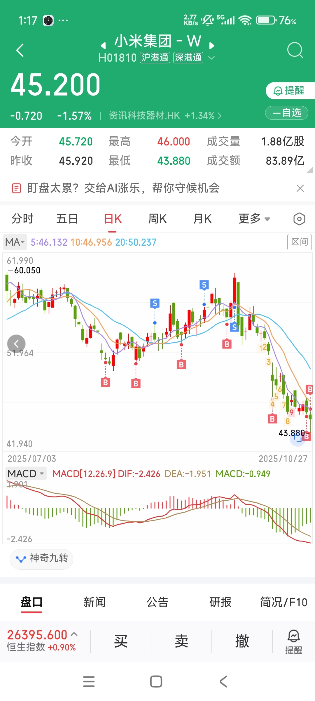 $小米集团-W(HK|01810)$ 机构在53元的价格都敢买,现在45元相当于85折,小散们这么便宜反而不敢买了,怎么想的,非要看见小米涨上100元了才去追吗?,这几天小米是处于公布季报的空窗期不能买,否则按照之前的回购节奏又要回购几十亿了,反正我是越跌越买,知行合一,不到100元坚决不卖